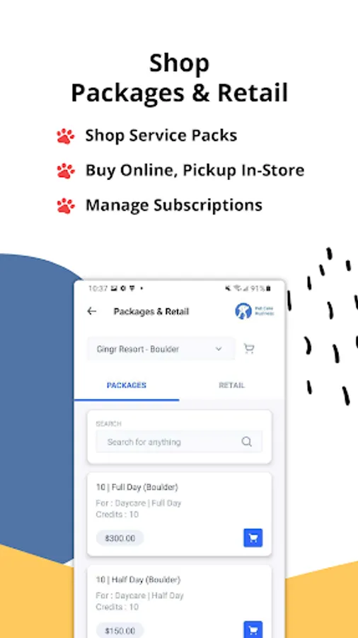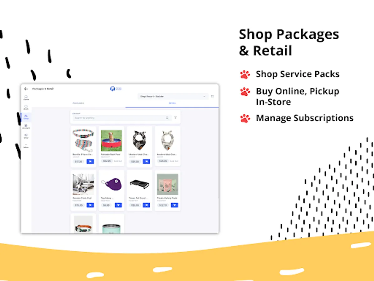 Buy service packages, start a subscription, pay balances, and more with ease. You can even buy retail products like accessories, treats, and more for your pet and pick them up in-store!
