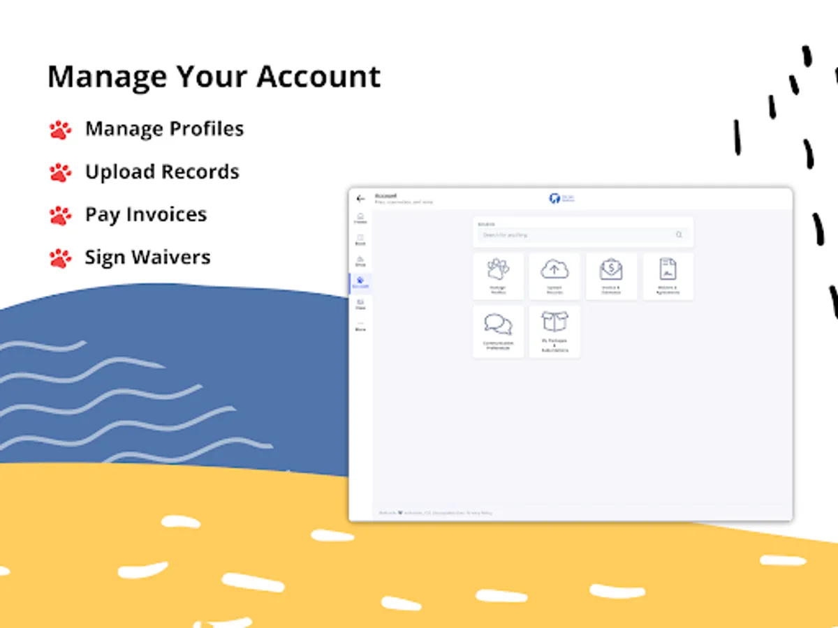 Manage everything for your account in one place. Register at your favorite pet-care business to manage your account by uploading veterinary records, viewing your invoices, and signing facility waivers and agreements!