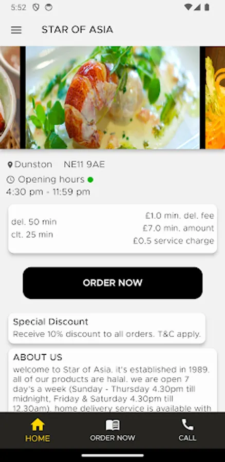 Welcome to Star of Asia. it's established in 1989. all of our products are halal. we are open 7 day's a week (Sunday - Thursday 4.30pm till midnight, Friday & Saturday 4.30pm till 12.30am). home delivery service is available with extra charge.
