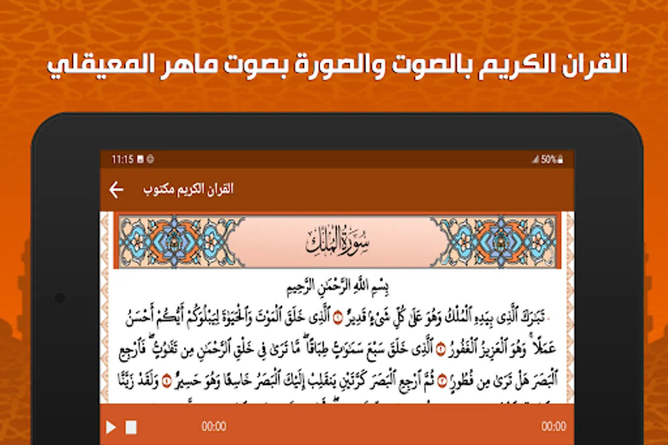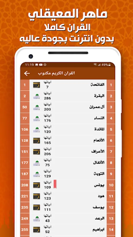 This program offers you the entire Holy Qur’an with the voice of Maher Al-Muaqili, written in a clear, large and colorful handwriting without the net with the feature of listening and reading the surahs, voice and image at the same time, and save the page with a sign to make it easier for you to return to where you stopped reading