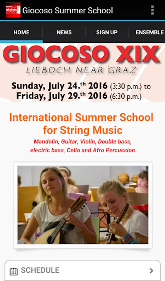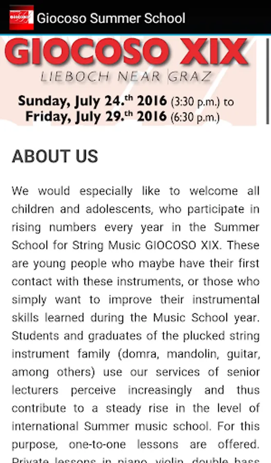 We would especially like to welcome all children and adolescents, who participate in rising numbers every year in the Summer School for String Music GIOCOSO XIX. These are young people who maybe have their first contact with these instruments, or those who simply want to improve their instrumental skills learned during the Music School year. For this purpose, one-to-one lessons are offered. Of particular importance is also the experience of playing music together, in duos, trios and in chamber music ensembles. Traditionally, this seminar also addresses those experienced, still ‘young at heart’ free time musicians who – under the professional guidance of the instructors – play their instrument to their best here in Lieboch. Every evening a rehearsal of the seminar orchestra takes place, where the instructors surprise with new arrangements and freshly printed works from well-renowned publishing houses. Every year the sessions with Afro-percussions are something new for all participants, since the teaching is done very vividly, using African drums. In this way, the rhythmic understanding of everyone taking part in these group sessions is developed individually.