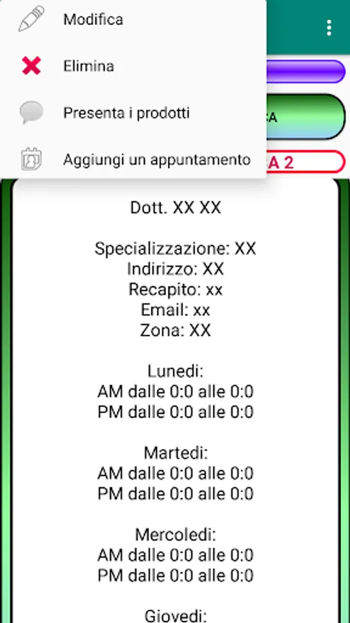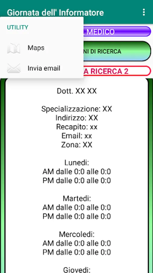 App designed for scientific informants. You can save your name, address, phone number, doctor's visit times and products presented. Modify, delete the data entered and search for doctors by area, address, name or surname. You can connect directly to google maps to reach the doctor's office. You will also have a history of visits with the reference date. All to try!