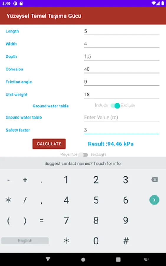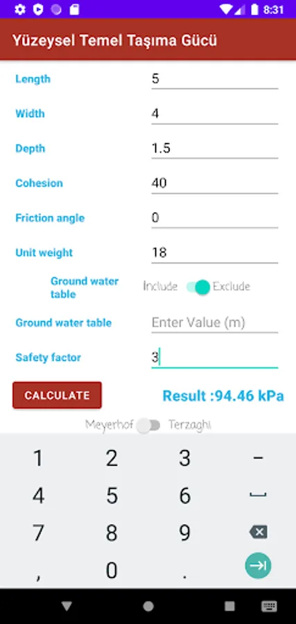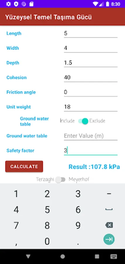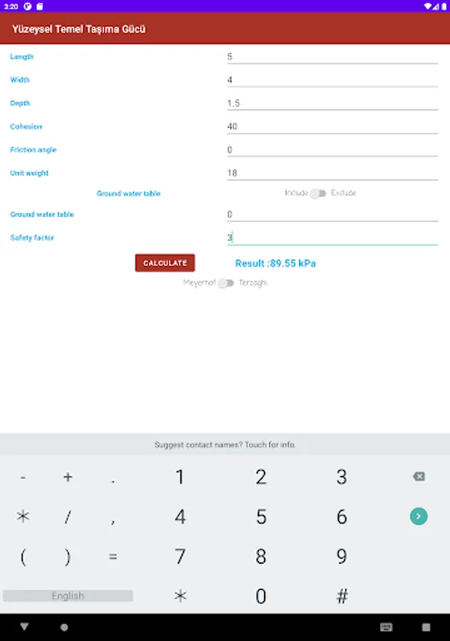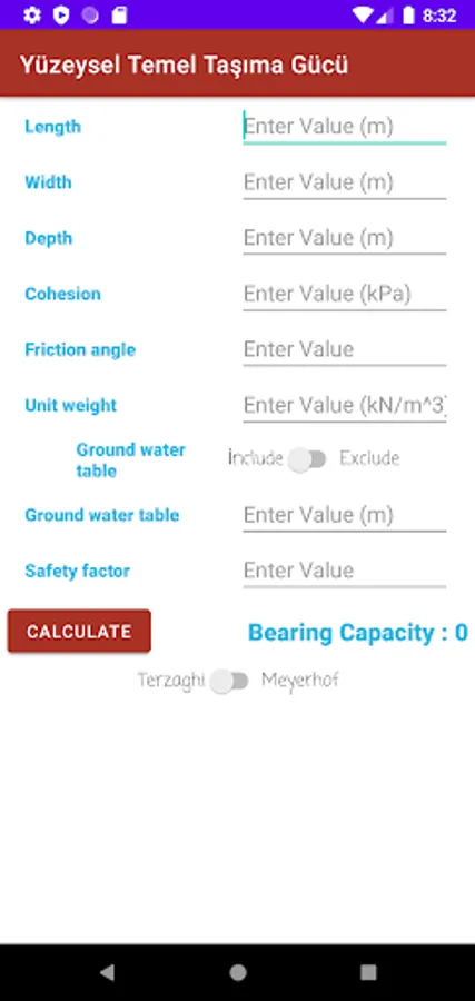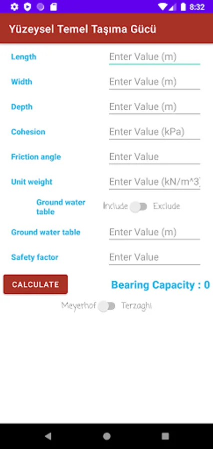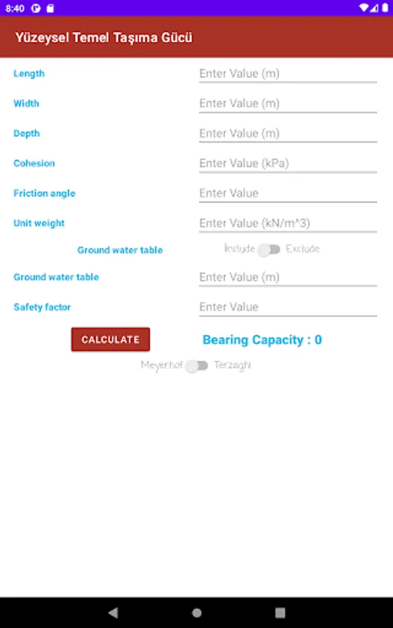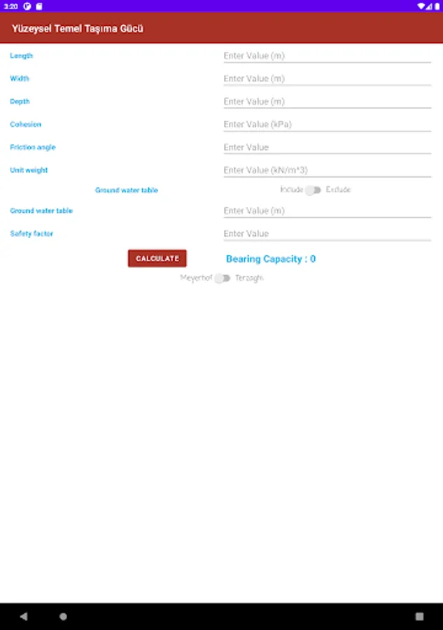 You will be able to easily calculate bearing capacity according to Terzaghi and Meyerhof methods through this mobile application.