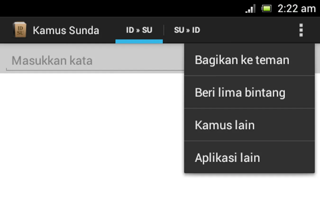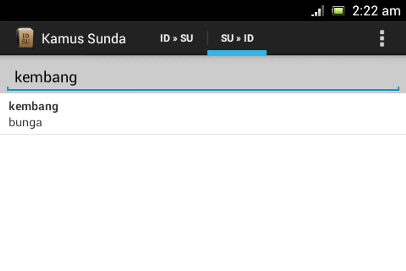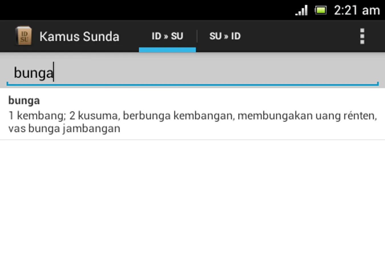 Sundanese Dictionary is Sundanese offline translator from Indonesian to Sundanese and vice versa.