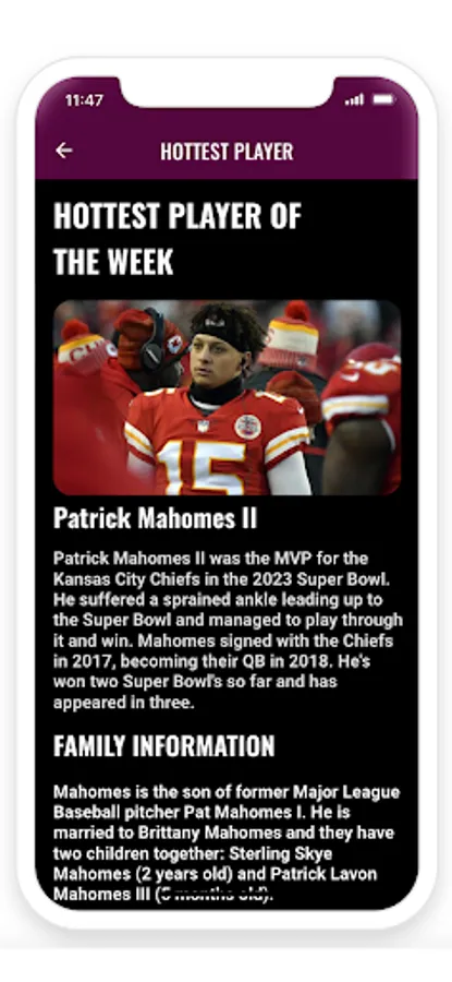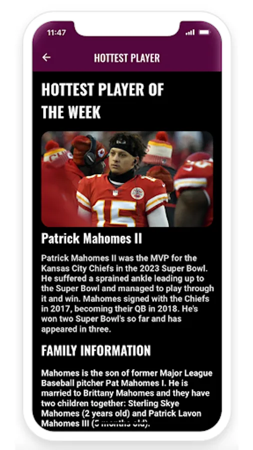 There are different sections from learning about the NFL, to seeing the schedule, where to watch your favorite team, hottest player of the week, fun fact of the week, and recipe of the week. There's also a chat box for any questions pertaining to the app or the NFL.