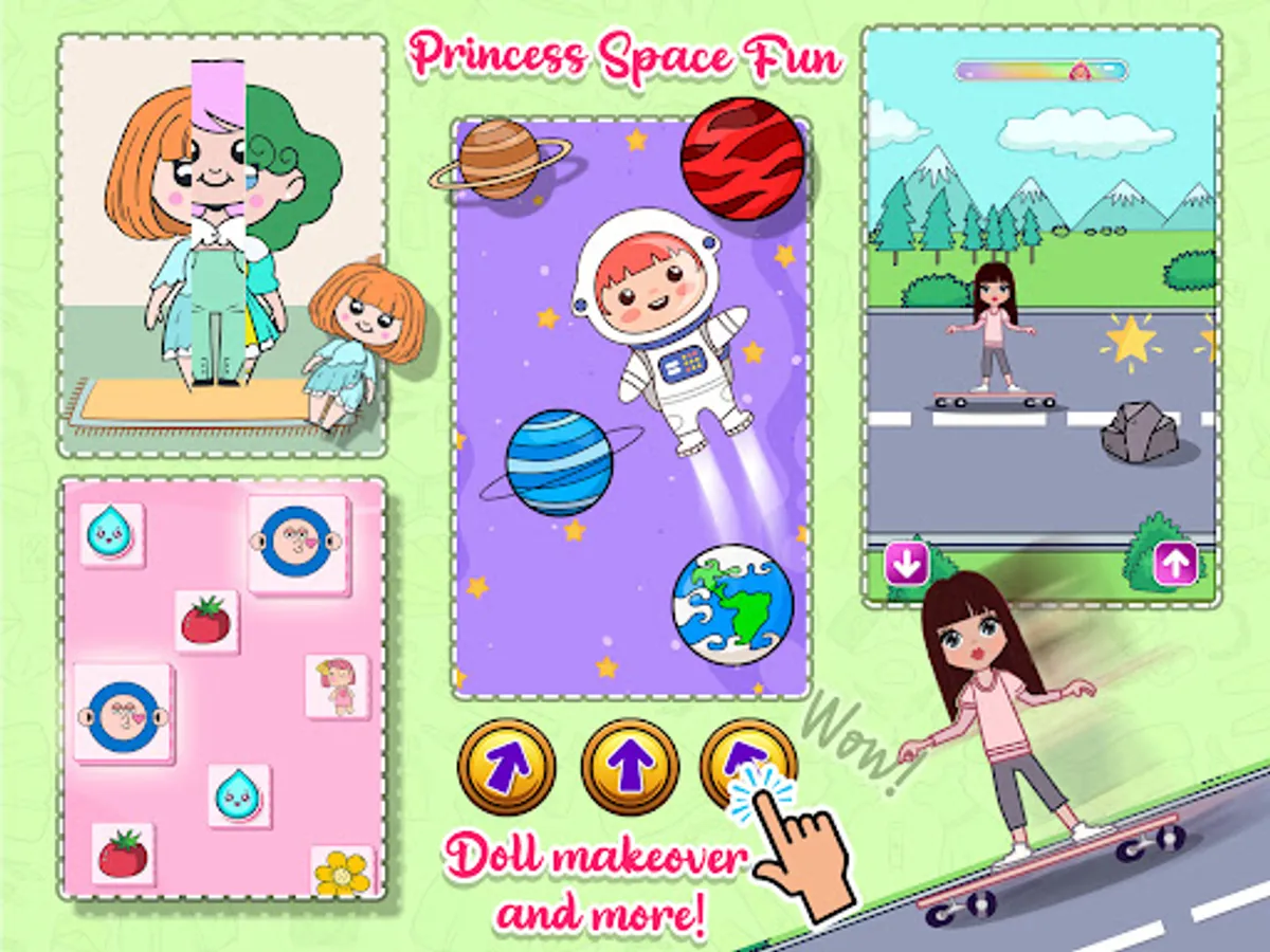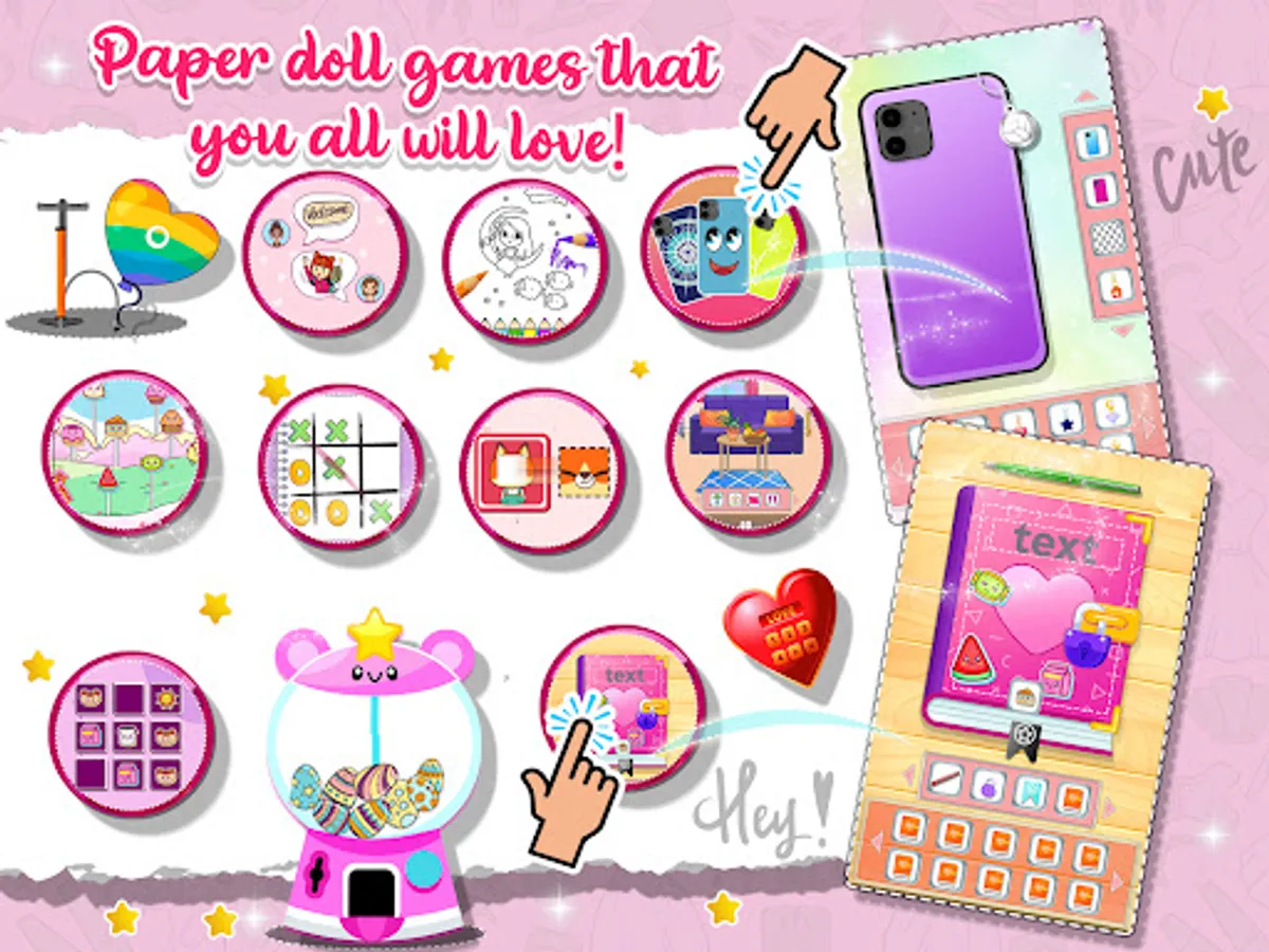 Enjoy many more mini games like Music Tiles, Fruit Slash, Candy Catch, Astronaut Space Fun, Memory Match, Emoji Match, Tic Tac Toe, Princess Coloring Book, Surprise Eggs and many more paper doll games for girls!