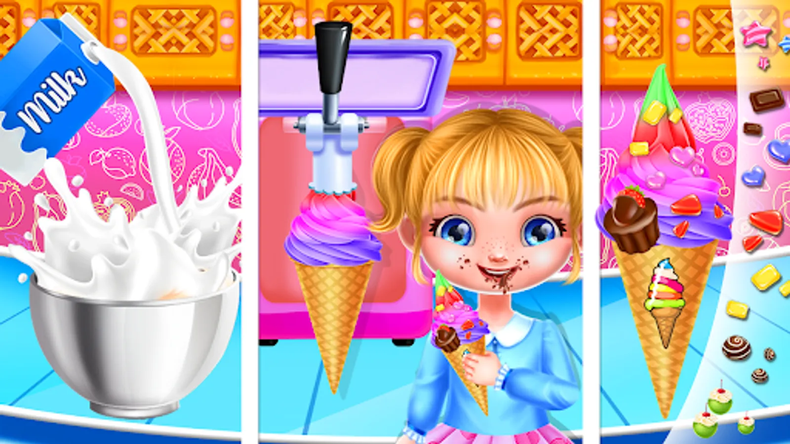 All kids love to have juice but be careful while cutting the fruits for juices and grand it with the milk. Variety of fruits options are available in cooking educational app. Pasta are the favorite food for all the kids so make sure you coked it well and all the sauces and salt are balanced. While making pizza make sure you dough don’t get so hard so cook it well in oven to make a tasty pizza for the kids school breakfast at morning. All day breakfast options are very interesting for preschool kids and learners in this girls games like making burger with the cheese and omelet is also a learnable activity for kids. Kids can learn how to cut the vegetables in proper pieces and fry the eggs. Cup cakes chocolate is amazing and tasty in yummy breakfast meals. Sandwiches are the best option if kids want to have some thing light to carry in their lunch boxes. In summer school kids are very curious about ice creams which is the most tasty meal for the kids.