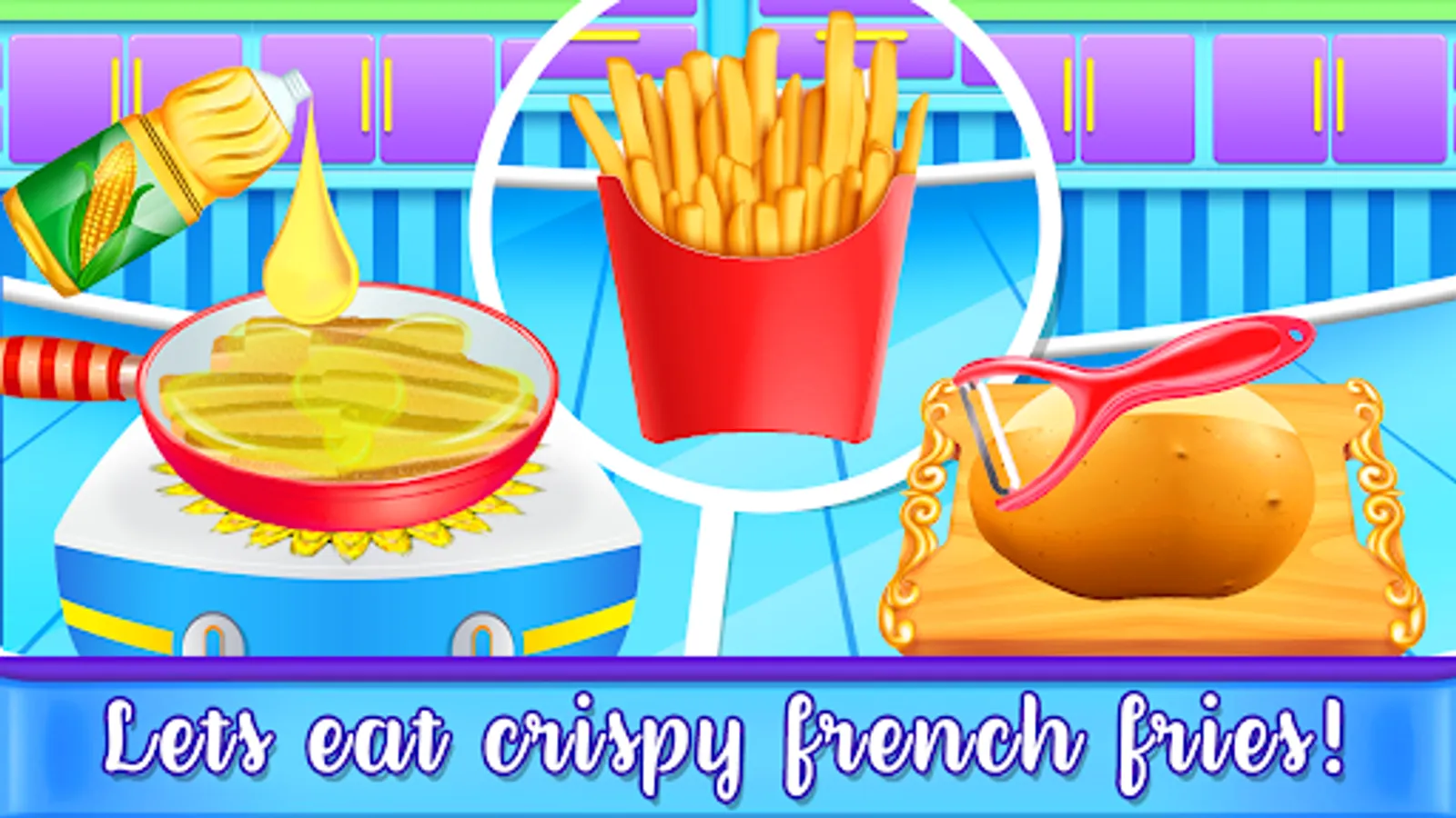 Fair food maker needs to learn how to prepare Fries, peel of the potatoes and cut in machine and little kids have to fry them well. Little kids and sweet girls in cooking games can do decoration after cooking food well like nuts , sprinkles, fruits, candies, chocolates, sauces, salt, black paper and many ad ons are available for the kids to play with and having fun with the school kids breakfast cooking games.