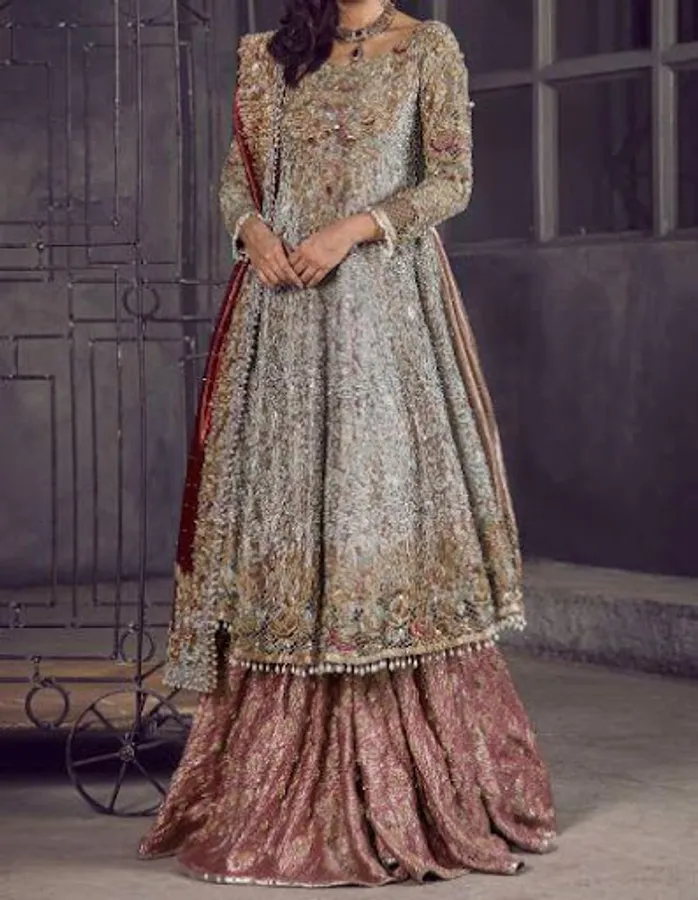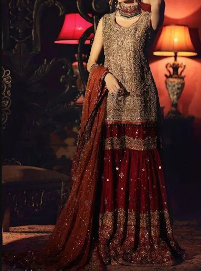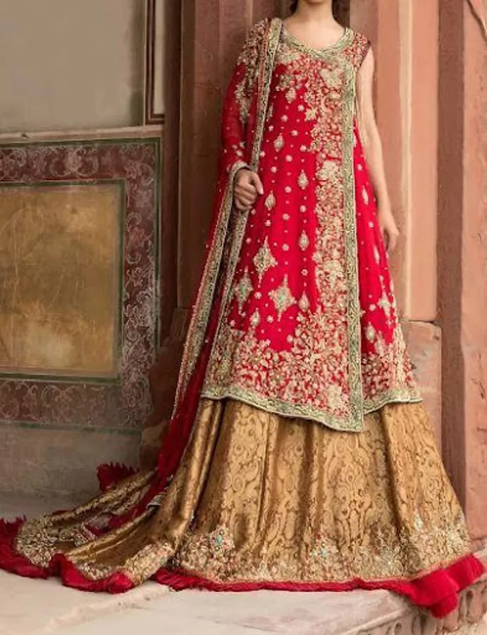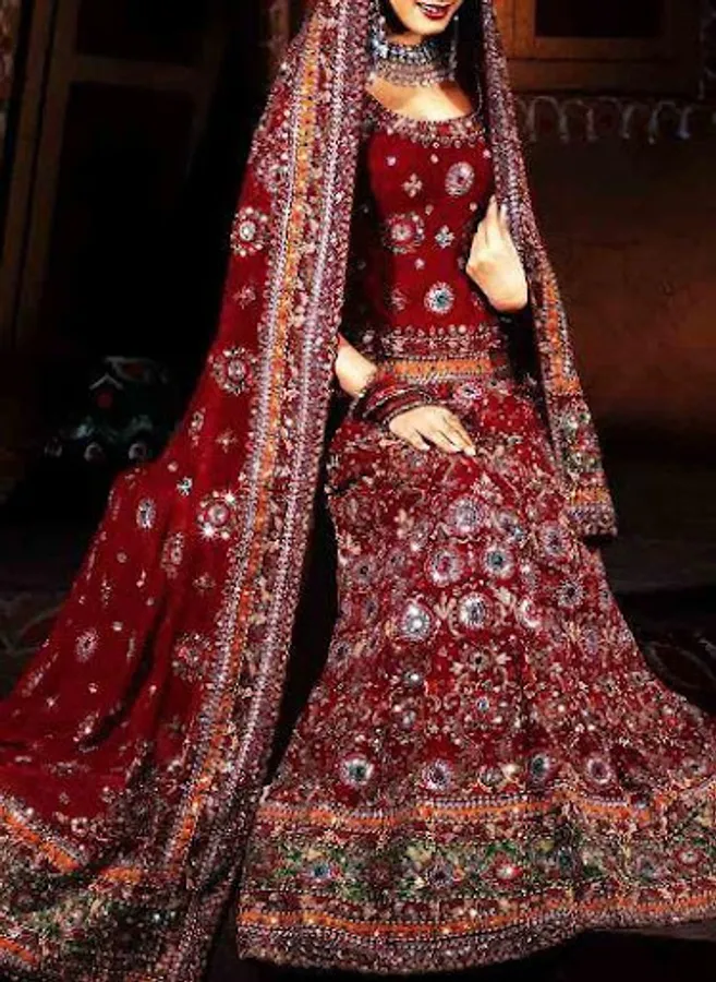 The fabric for bridal clothes which look best is chiffon, net, banarsi kapra, jamavar and katan. Chiffon and aurganza are usually used to design dupattas with heavy work on the borders for dulhan.