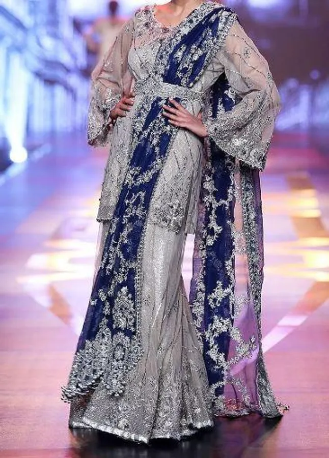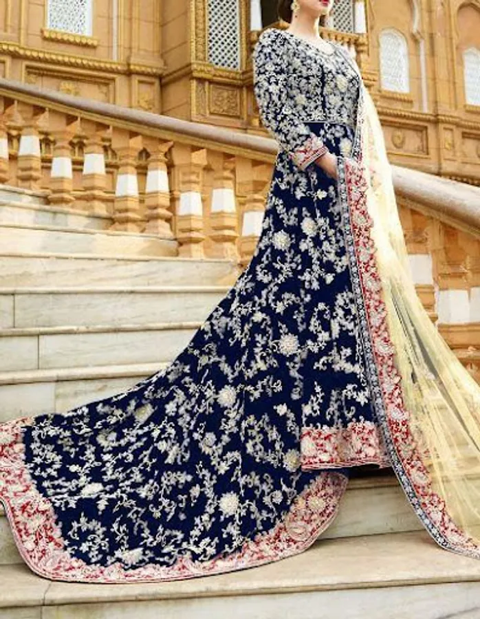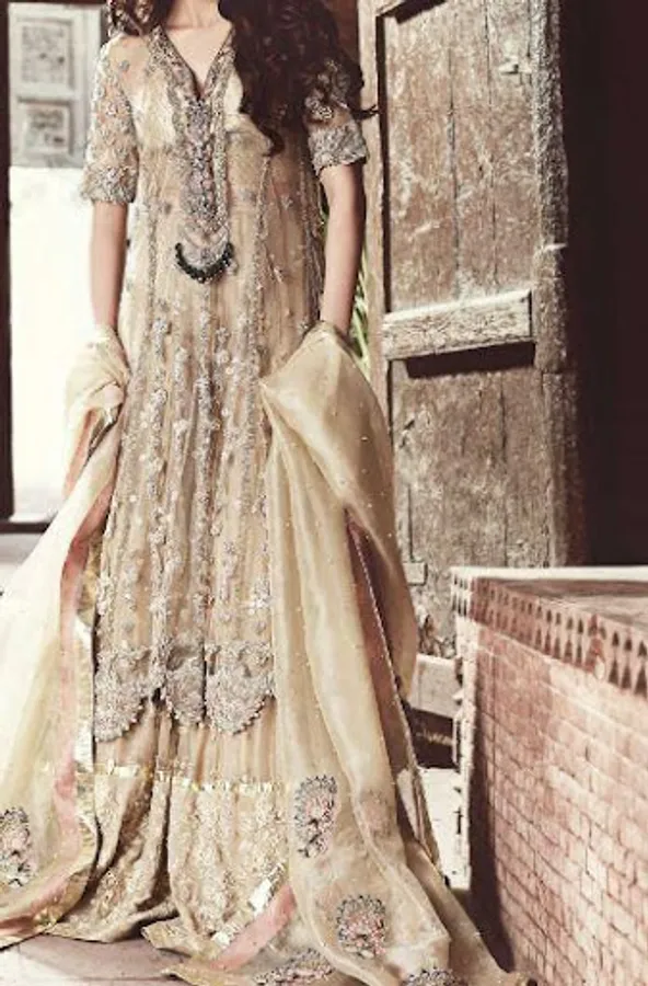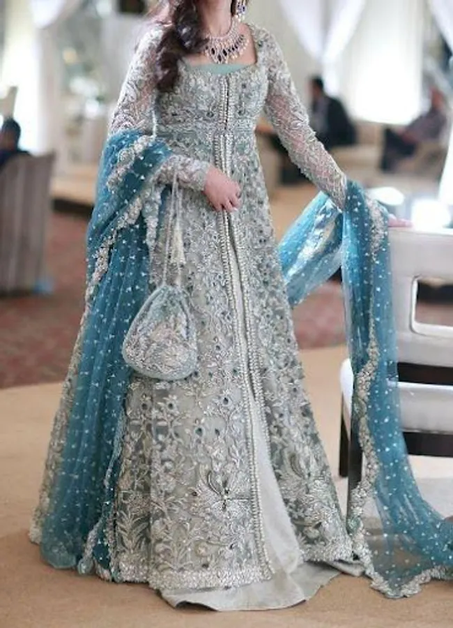 Fancy frocks in multiple colors with heavy embroidery on neck and daman are also worn by girls at their engagement and wedding. Indian and Pakistani both girls prefer lehenga and gowns as their first choice but to change the theme; frocks are also worn on walima ceremony.