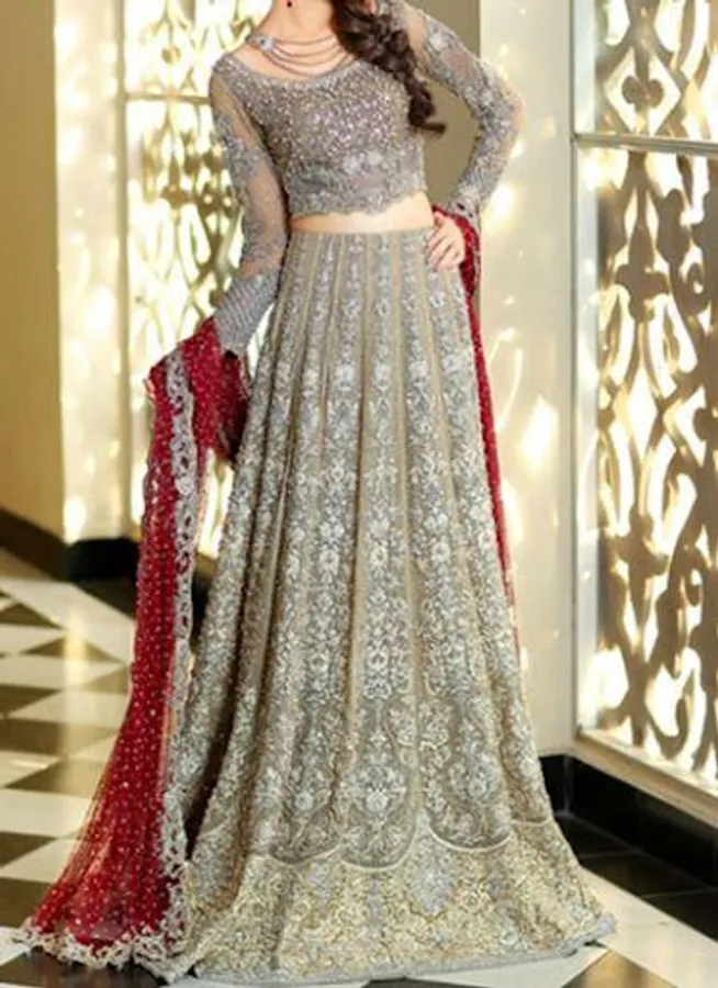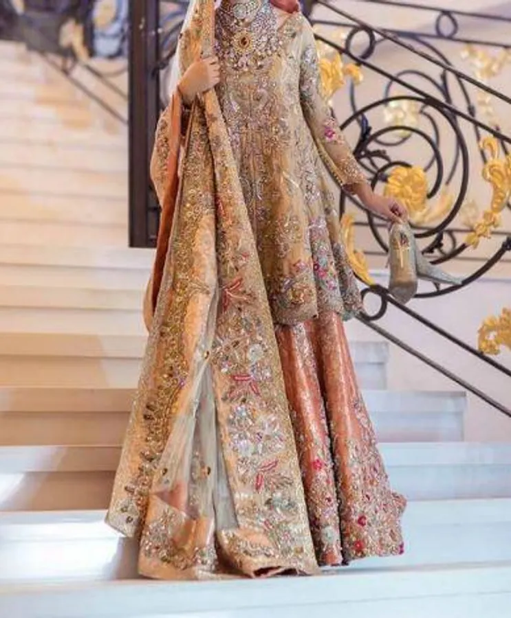 2017-18 is all about fashion and the brides prefer to wear a long shirt with beautiful lehenga in the weddings. The shirts are either full of embroidery or rhinestone work. Another option is to go for tillay ka kam or fancy motives which will make the shirt look mind blowing. The lehenga can either be simple or designed with embroidered and other fancy work patterns. Blood red is the favorite color of bridal girls but colors like peach, white with gold dust, purple, pink, blue and sea green are also in fashion these days.