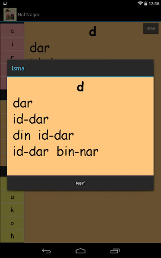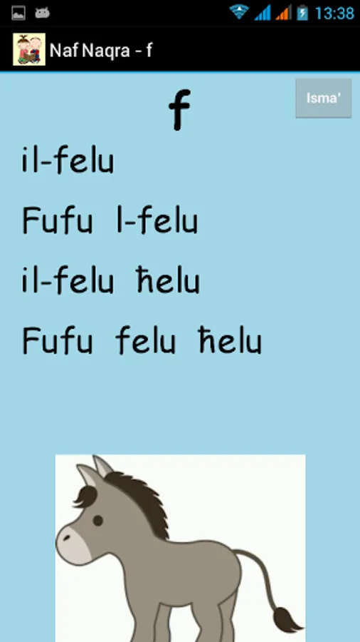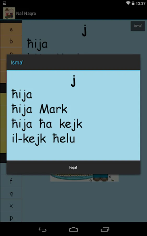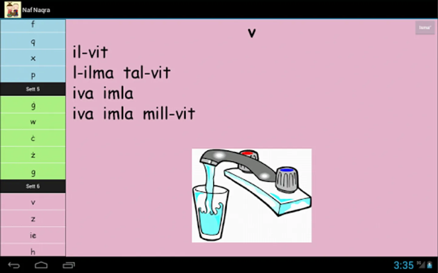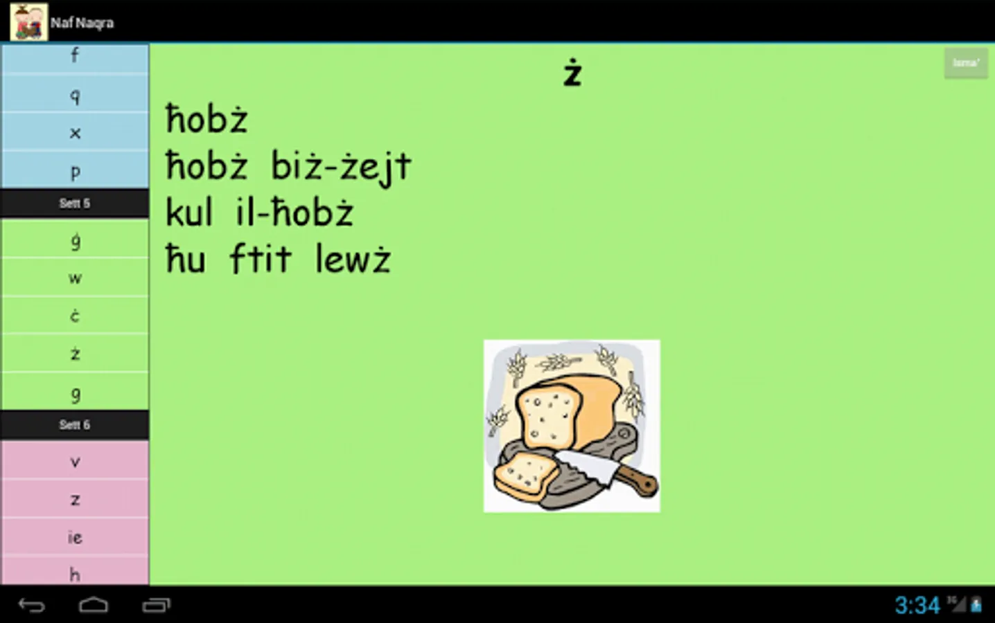 - il-qari : buttuna tas-smigħ b'aċċess għal mudell ta' qari fonetiku (phonics) li jista' jintuża bħala introduzzjoni għal ittra ġdida