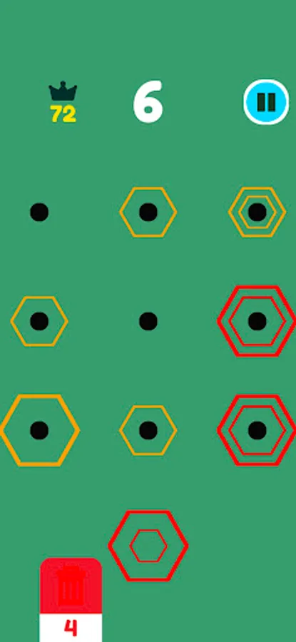 - Arrange hexagon of different sizes and colors on a puzzle board. Creating a 3 hexagon line of the same color, regardless of size, will clear them and grant points