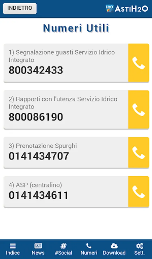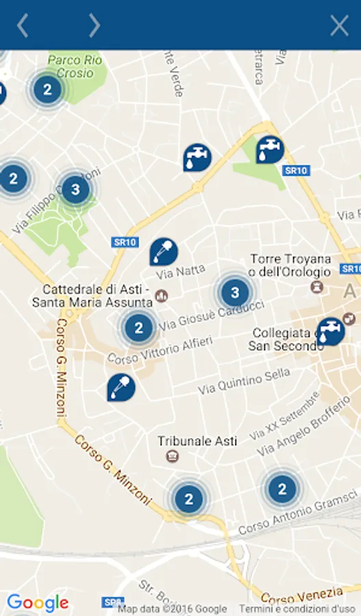 Not only you can access and view of water supply points (fountains, water houses, sampling points) and be informed on the useful numbers to contact ASP Asti.