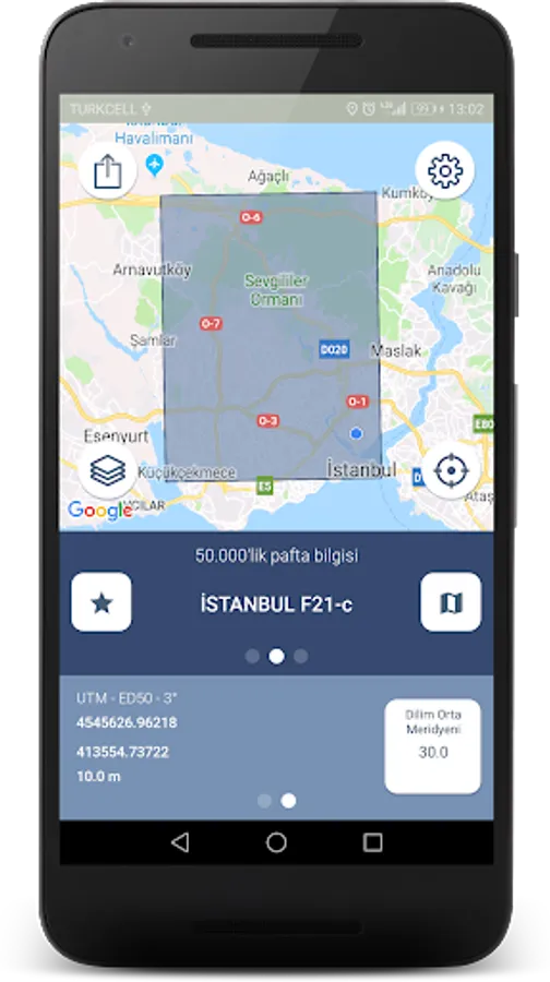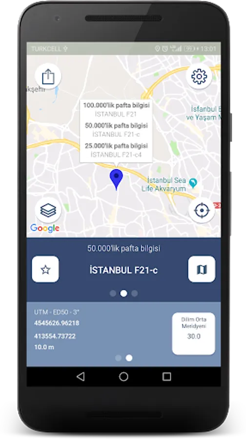 You can also view the maps you have queryed on the map or you can access the map information from another location on the map. You can also access the information of the middle meridian in 3 degree and 6 degree slice from your current position.