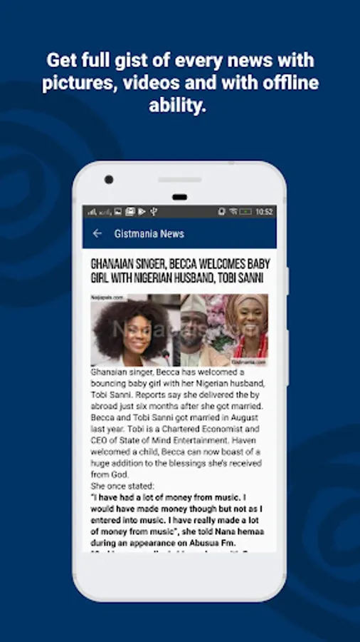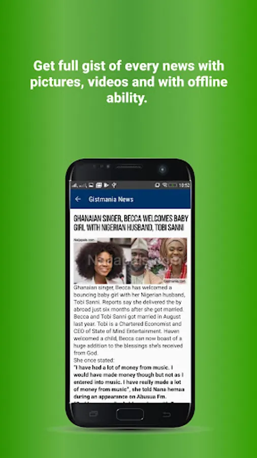 Gistmania/Naijapals is the app for popular Nigerian website www.gistmania.com produced by Naijapals, With over 1 million interacting members you can discuss and contribute to all the latest news, It  gives you the ability to read and discuss all the latest and hottest Nigerian news topics ranging from areas of entertainment & celebrities, sports, politics, lifestyle and general news from Nigeria, Africa and World-wide. Features of the apps includes push notifications, star marking, sleek sync and much more - all these to enable an enjoyable usage and experience of the app and allows you to access all the latest Nigerian news fast and easily