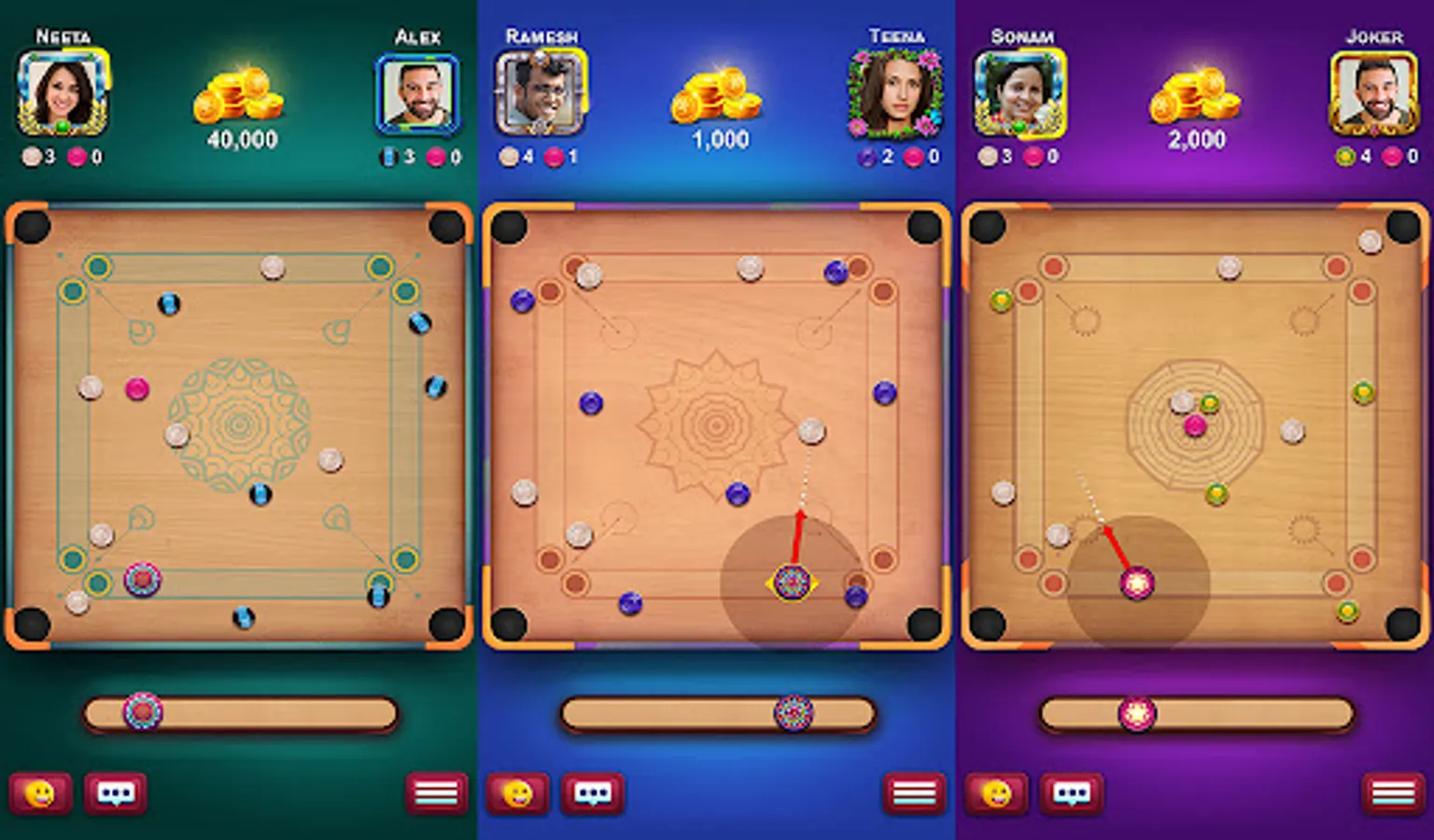 Top carrom game with mind-blowing features like Power Ups, Striker power & aim options, uniquely designed colorful pucks, and many more interesting collectibles.