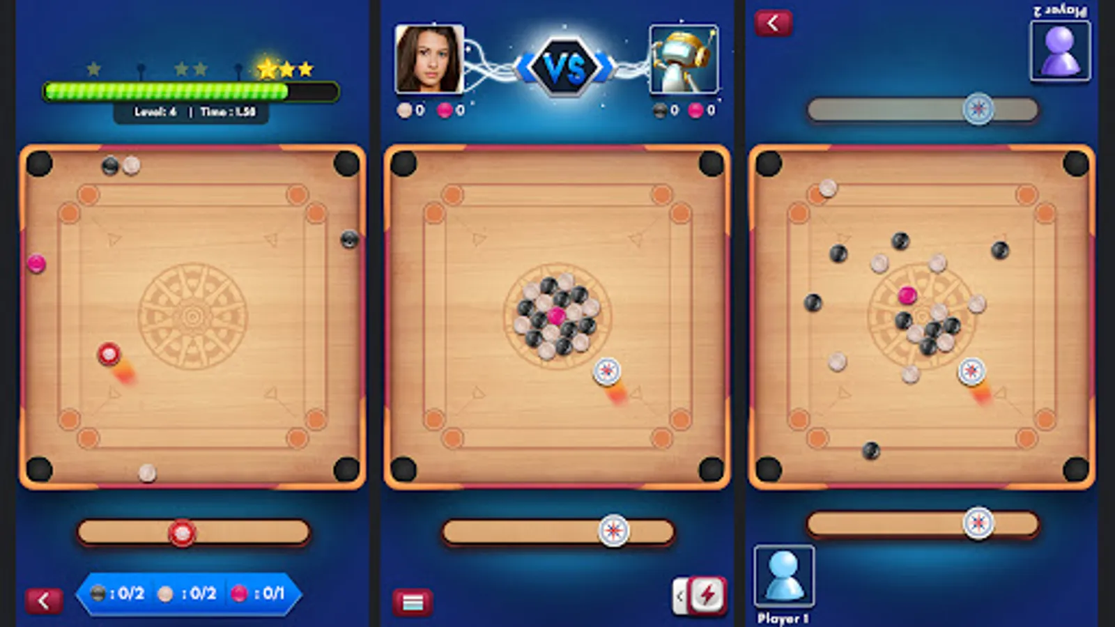 ★ Play Trick Shots a time-bound amazing mode with various levels to challenge your skills. The trick shots mode helps you to perfect your carrom moves with some really tricky levels testing your skills and reflexes