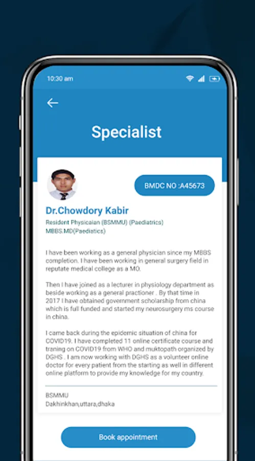 Docta makes it very convenient to locate excellent doctors and book appointments with them. Type the complaints to see a list of confirmed doctors directly with comprehensive details about their professional credentials, training, payments and more. You may also read real patient reviews before picking the period that fits you and scheduling your appointment.