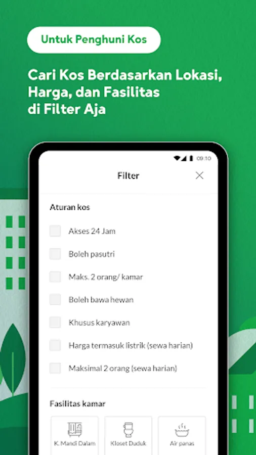 - Filter: Find the best kos result by customizing your desired location, price, type of properties, duration of the rental, and other facilities.