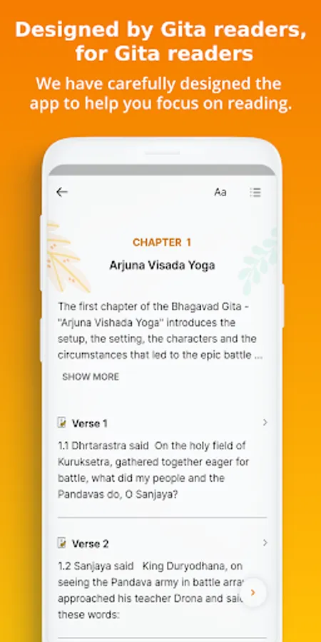 Use the Verse of the Day feature to memorize and practice Bhagavad Geeta's learnings with a new verse every day.