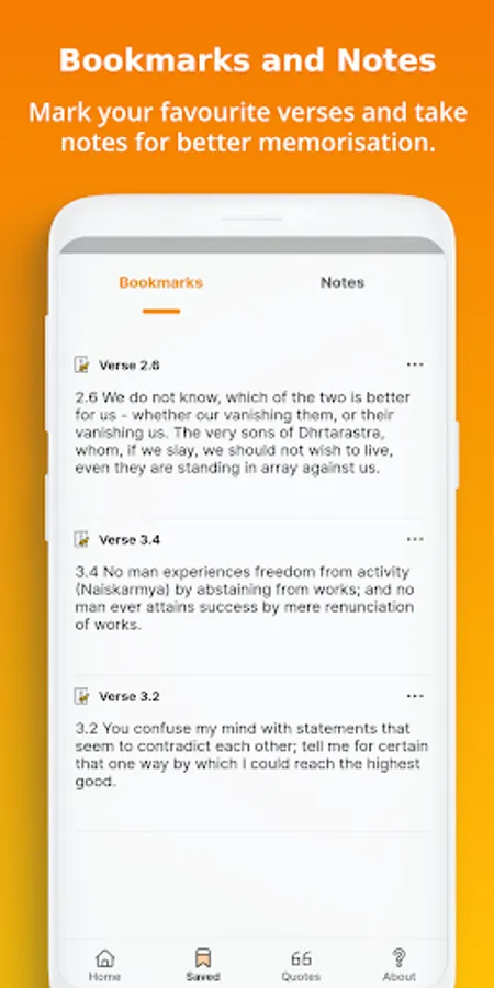 In the Bhagavad Gita app, you can add multiple bookmarks so you can access those shlokas later on when you need them, which makes your reading experience incredibly convenient.