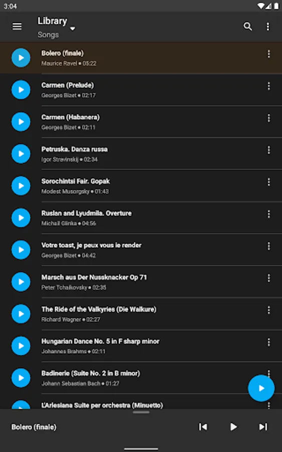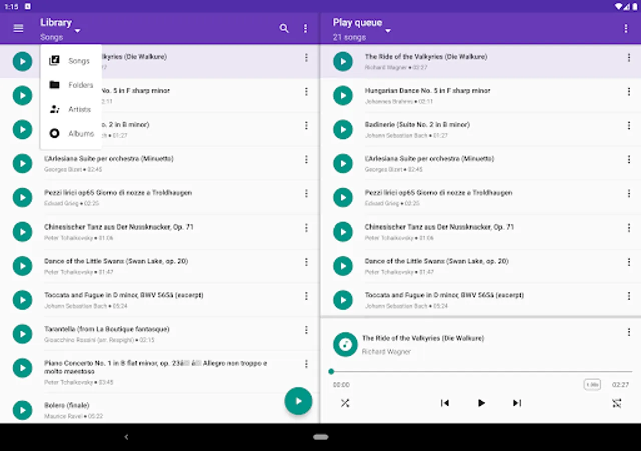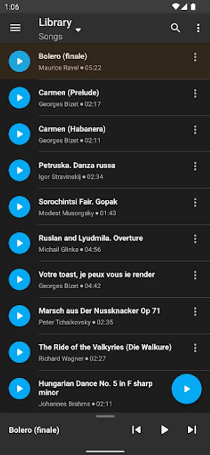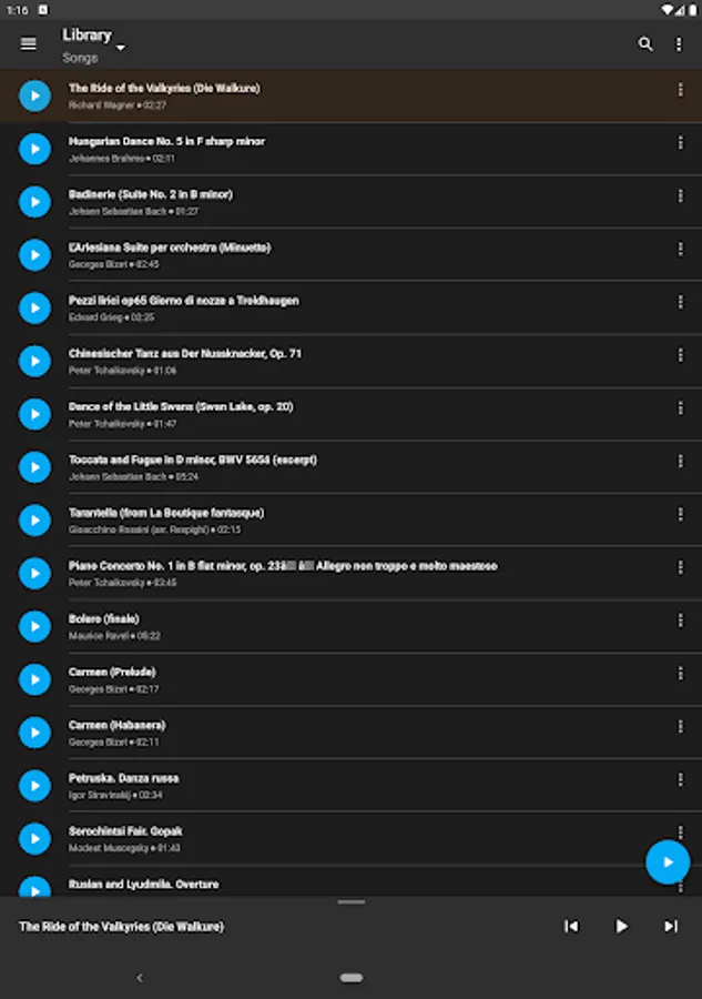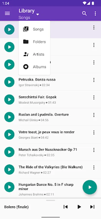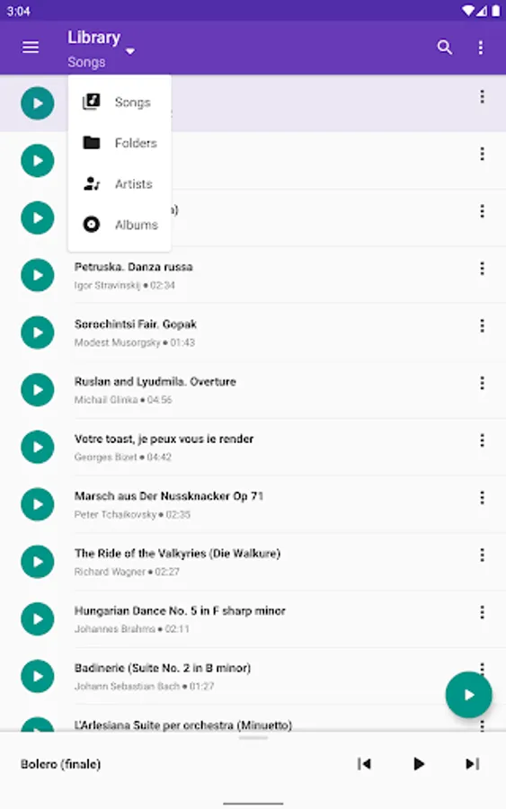 • Display music library on the device, by compositions, folders, artists or albums.