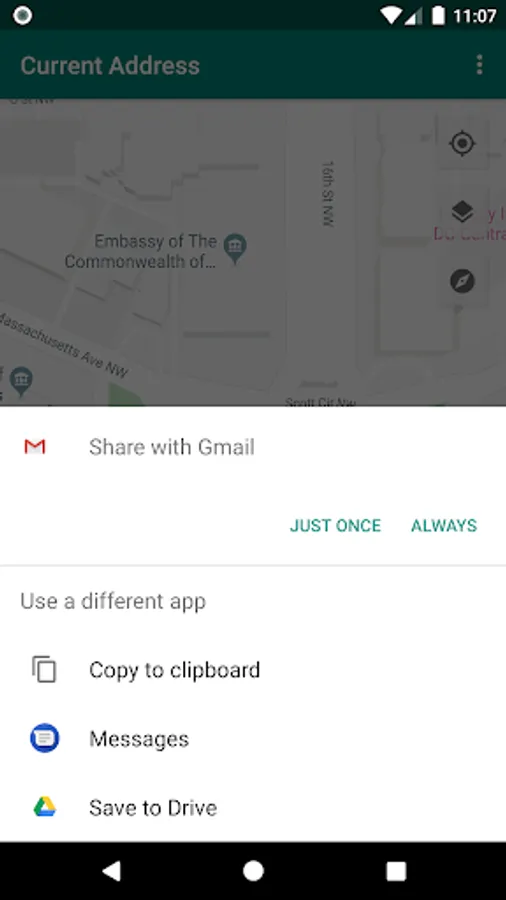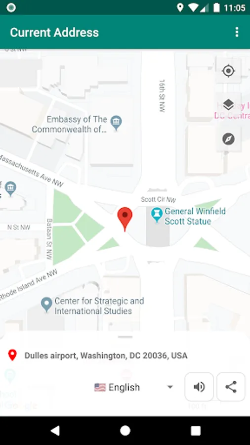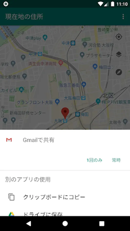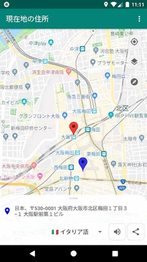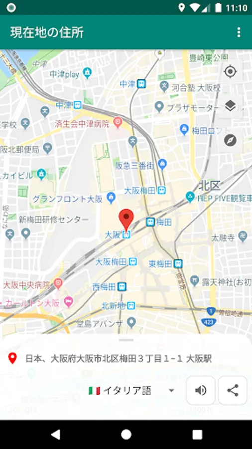 Based on the information acquired by GPS, the current location is displayed with a red pin.