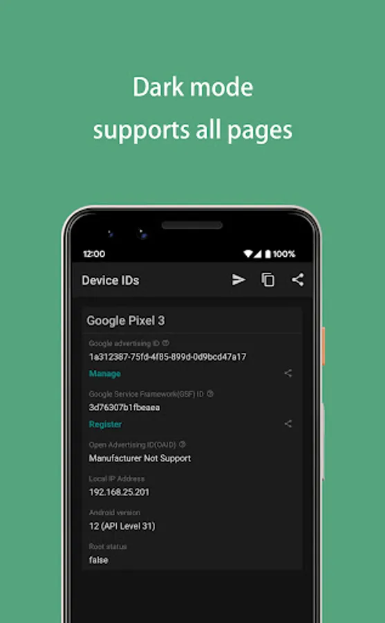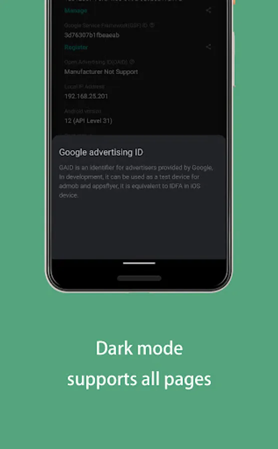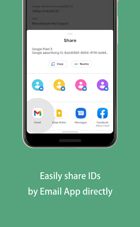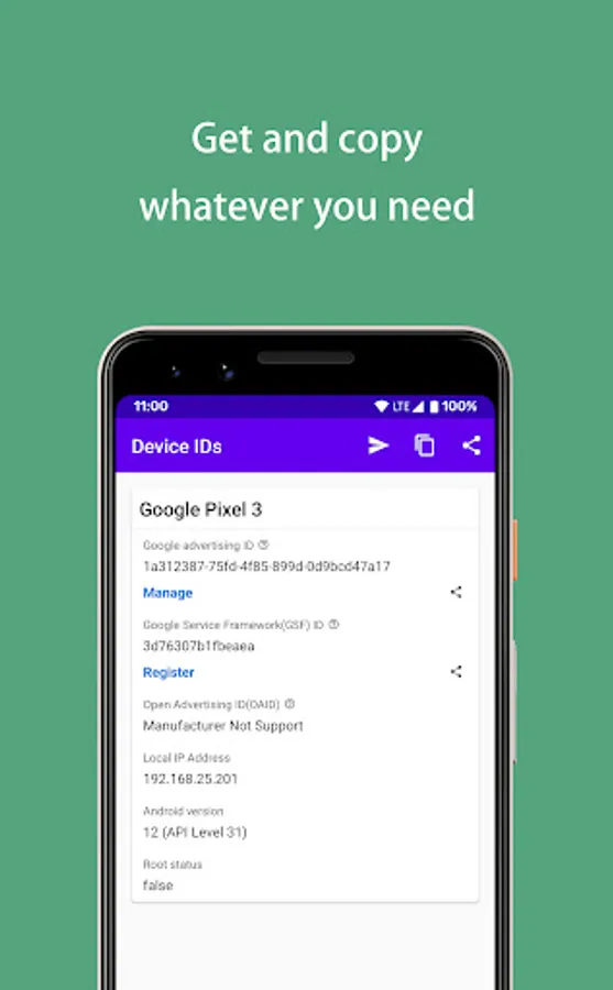 View and share your Device ID, Google Advertising ID(AAID, GAID), Google Services Framework ID(GSF ID), OAID and more.