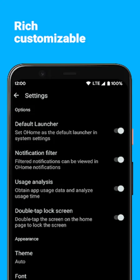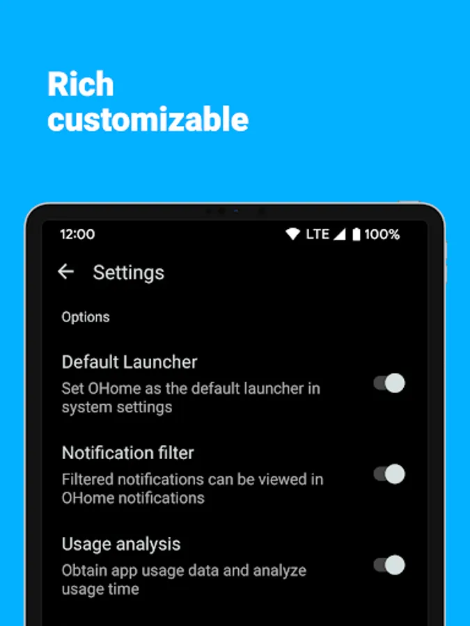 Opening OHome android launcher for the first time will pop up the application settings page. It is recommended to enable all the functions in the settings to enable the complete experience of OHome. OHome android launcher has a notification blocking function, it can help you control screen usage time and phone usage, no longer receive invalid information interference when you focus on life and work, but don't worry OHome launcher will block notifications Stored locally on your phone, you will never miss a notification. Simple and effective way to increase your productivity and focus. Another effective function of OHome desktop launcher is application time statistics, find out the culprit of time consumption, and uninstall it easily in OHome. it's a less is more app and a minimalist phone free to use. simplistic android launcher app. Get