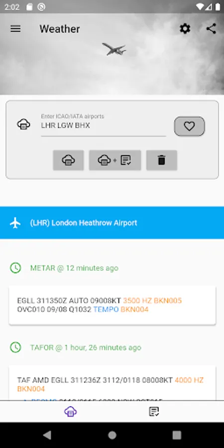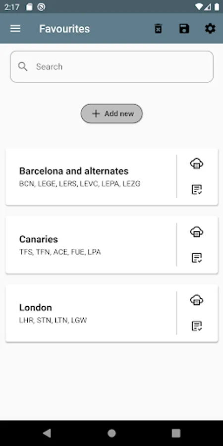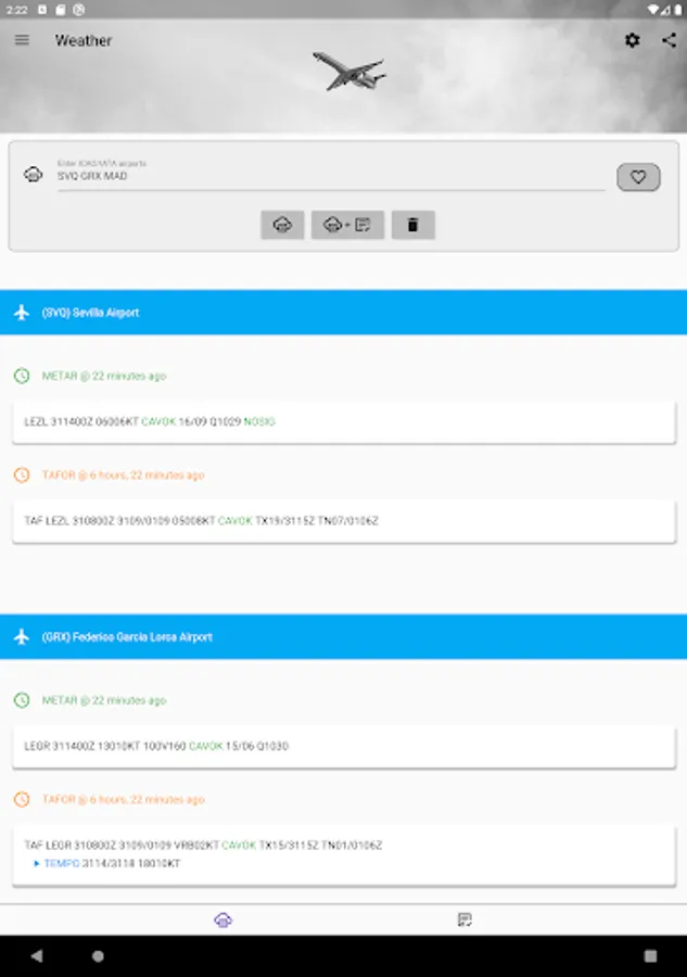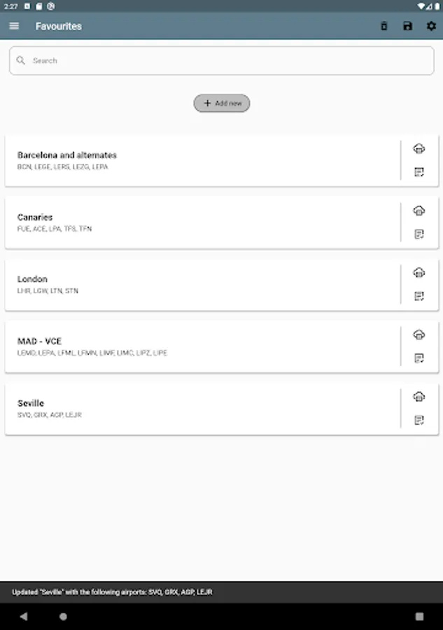 - Create a favourites list, so that it's easier to group your destinations, alternates, areas or routes and get the information without typing again all of them. Also, you can backup and share your list with a friend or import one!
