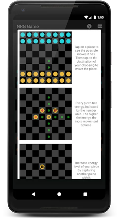 The game also offers a simple help screen with animated examples of each rule described. Tap "?" at the top bar in the app to see it.