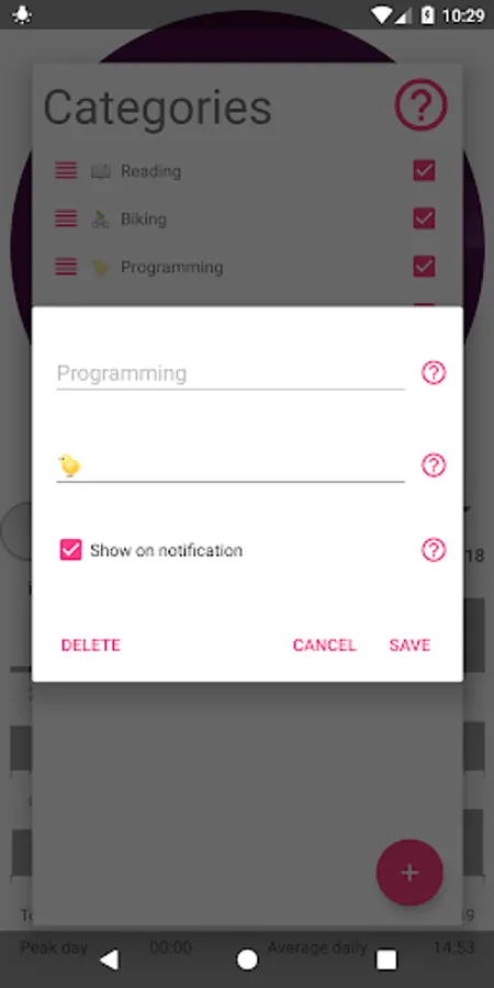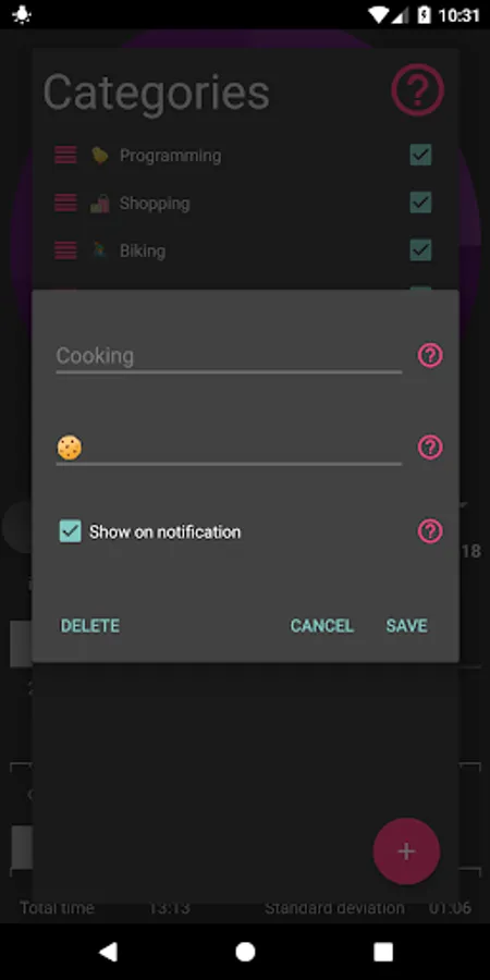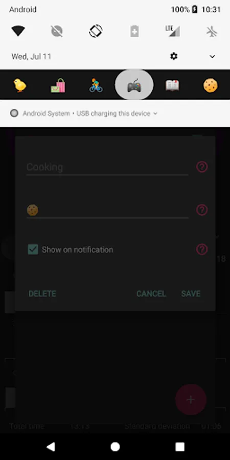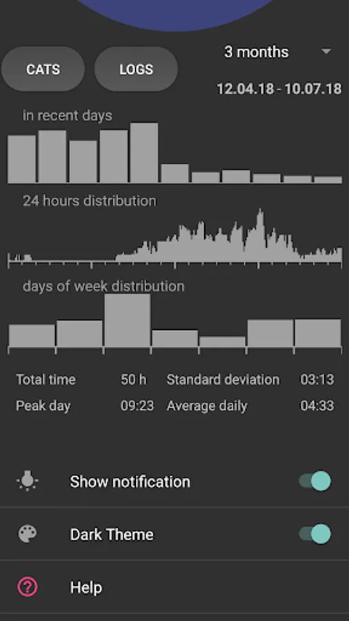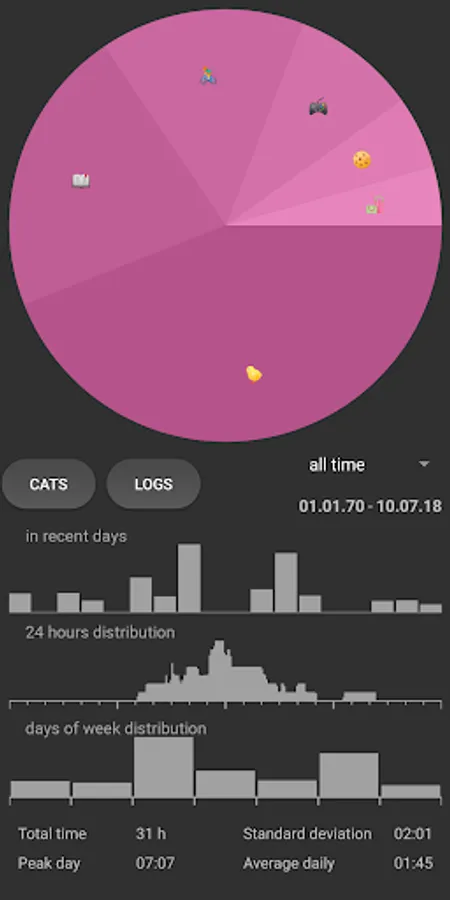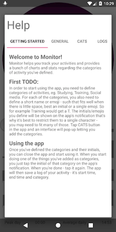 Tap on the notification when you start/end an activity. The app will track the time spent on each activity and let you know later on in form of charts and just a few statistics like daily average.