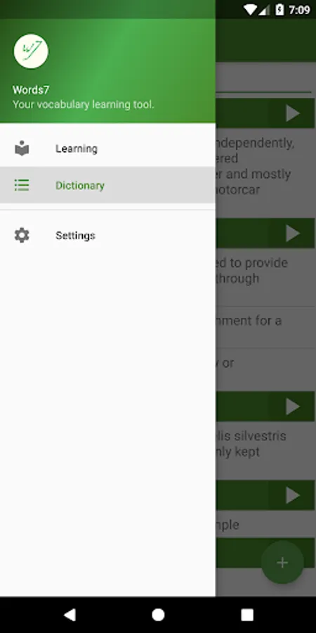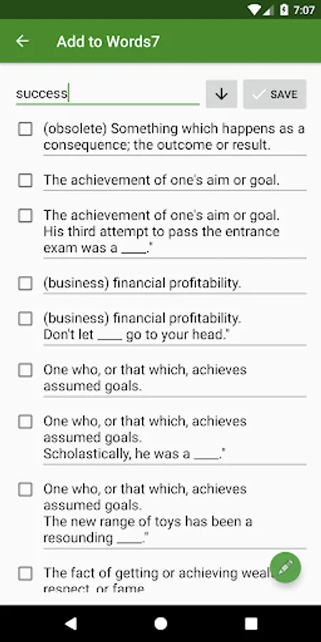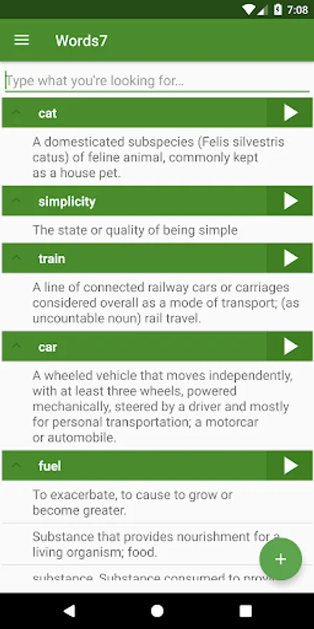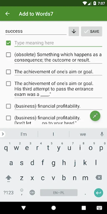 * automatically downloading meanings for the words you add (from Wiktionary). You can select which of the downloaded meanings to save as well as add your own meanings.