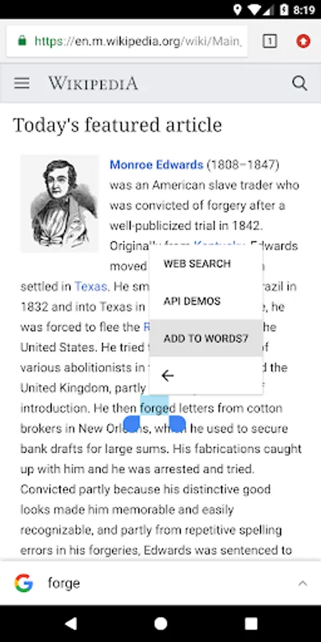 * adding words selected in other apps, wherever Android's context menu can be brought up on a selected text. For example while browsing the Web.