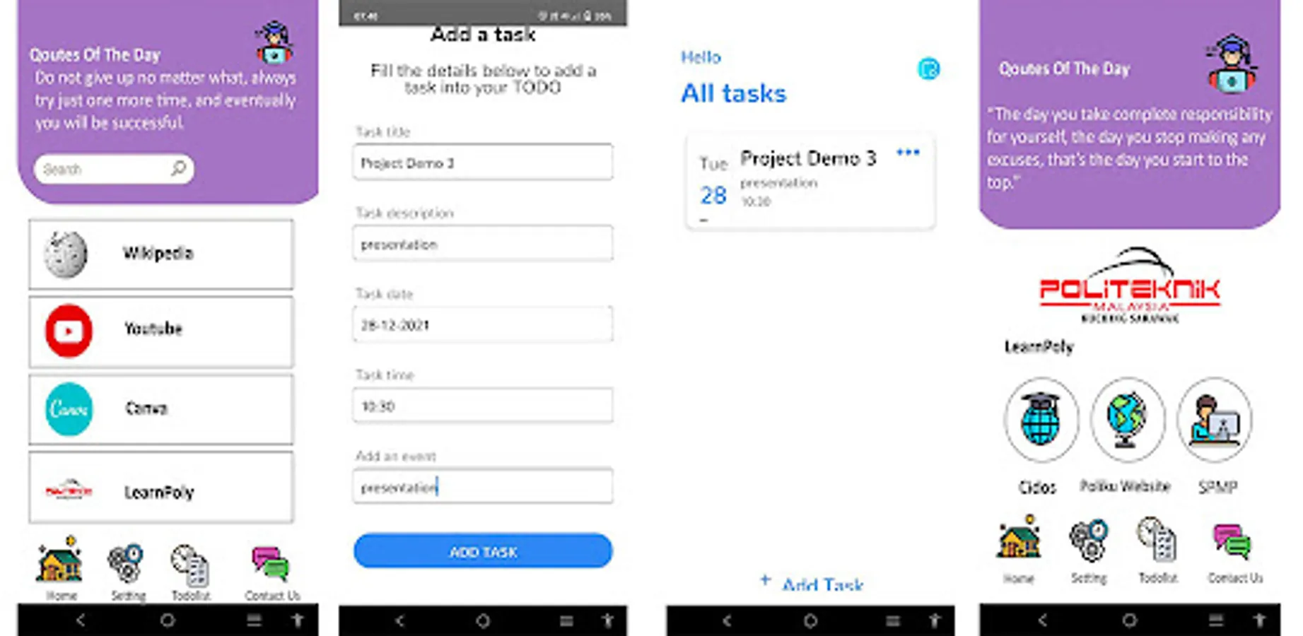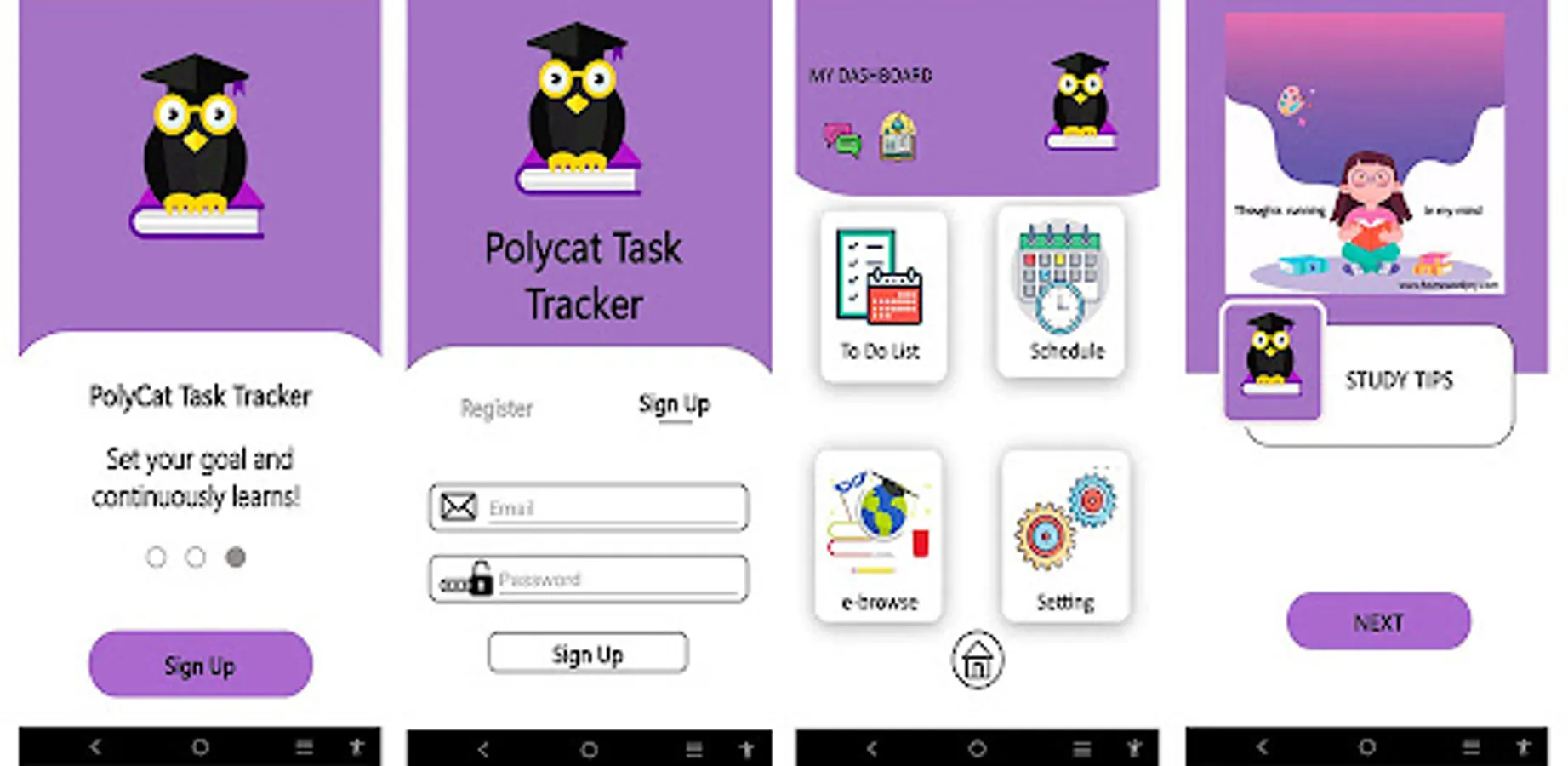 Task management is the process of monitoring works or tasks through various stages into task to be completed. These process are including the jot down list of tasks and alert with every due date of the task and tracking the tasks’ progress. Using manual way by using paper and pen to jot down any important tasks or works is a time consuming and inconvenient method where they may have lost the notes or disorganize list make it hard to catch up everything in studying. PolyCat Task Tracker is developed to improve this situation by keeping track task and managing time through mobile application. This application will help students or other user manage their task organize and time wisely. User can use this application to manage their list of tasks or works anywhere and anytime they want only just through mobile phone. This app also displayed study tips and allowed user to create their own schedule. User also can access any platform such as Wikipedia, Canva, Youtube and google search and more through this mobile app. Waterfall model is used to develop this mobile app. Questionnaires and interview is carried out in order to collect information. This application is only available in Android device.