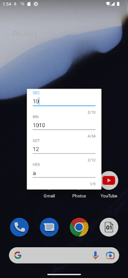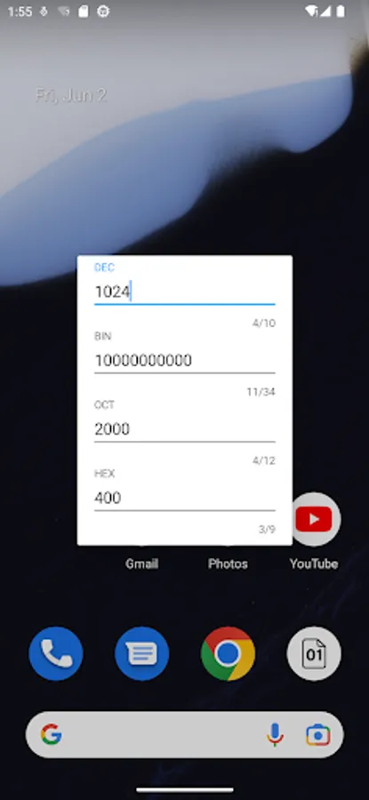 A calculator that provides conversion between decimal, binary, octal, and hexadecimal numbers. Provides a clean and intuitive user interface.