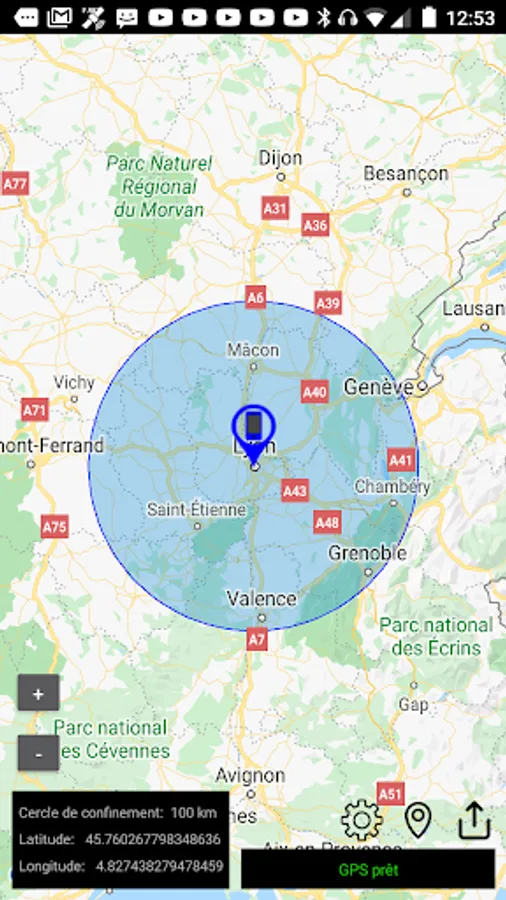 The application allows you to calculate a confinement area of 1km, 10km, 20km, 30km, 100km or 300km. around your GPS position. This allows you to respect and not to exceed the confinement area.