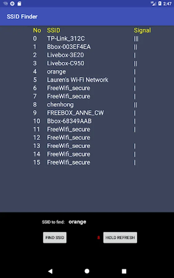 This application allow you to search and find WIFI networks by using their name also known as SSID. Simply enter the WIFI SSID and push the find button. Once the SSID you have entered has been find your device will vibrate and display a popup text.