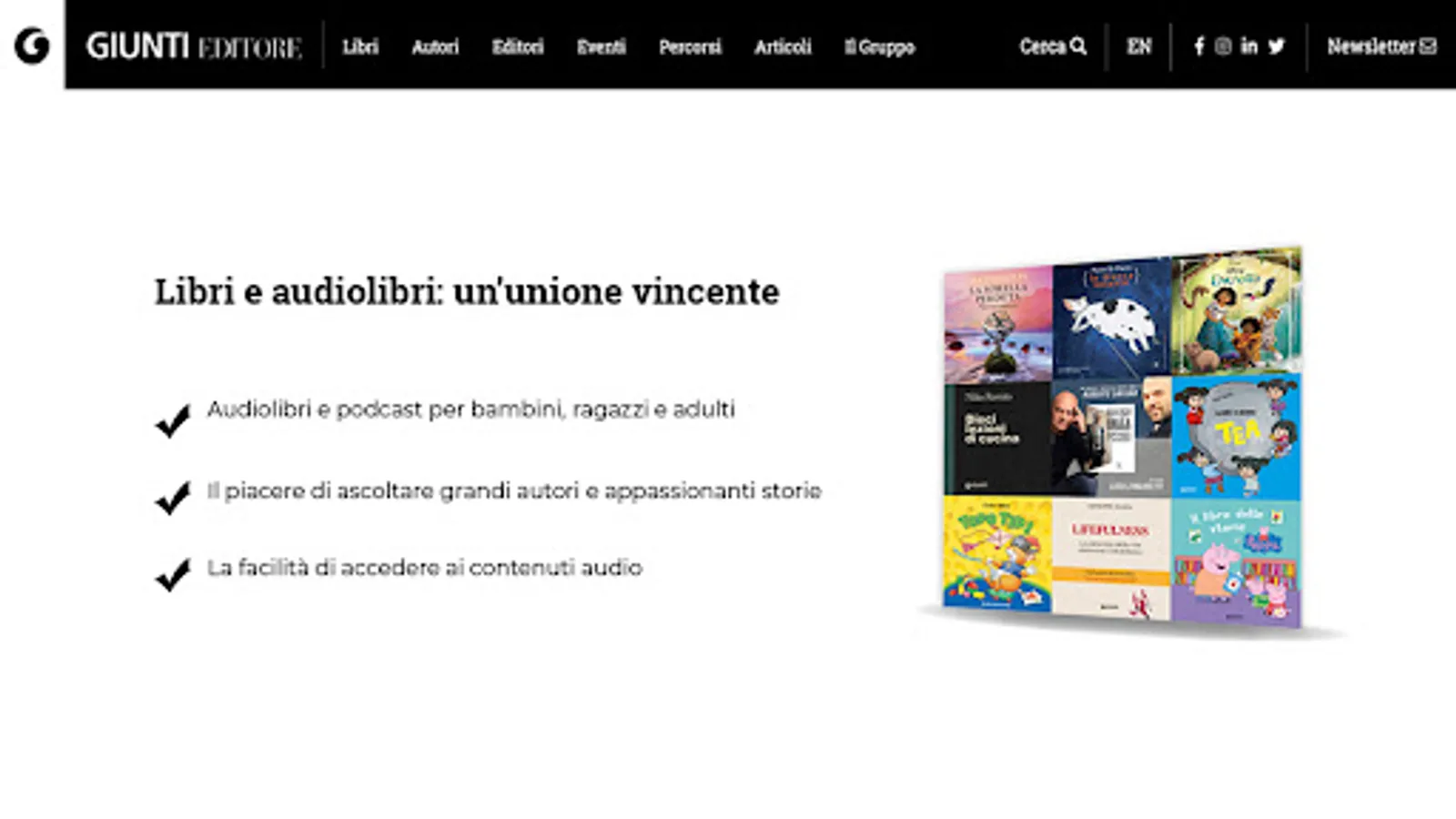 You can find audio content for children, teenagers and adults, representative of the main editorial genres and the various brands of the Giunti Group