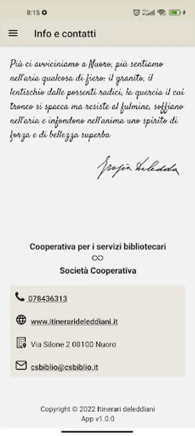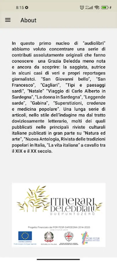 In this first nucleus of "audiobooks" we wanted to concentrate a series of absolutely original contributions that introduce a lesser known and yet to be discovered Grazia Deledda: the essayist, author in some cases of real journalistic reports.