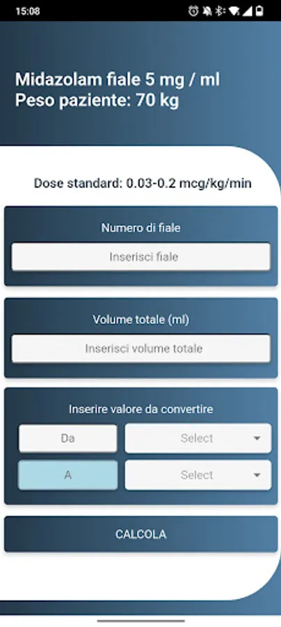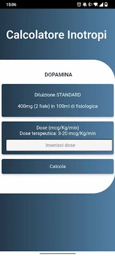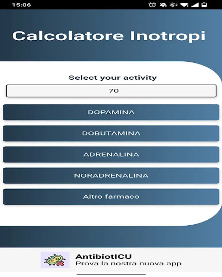 Standard and customized dilutions. Easy and intuitive conversion from mcg/kg/min to ml/h. A practical calculator has also been integrated dedicated to other drugs of anaesthesiological-resuscitation interest (Remifentanil, Midazolam, Propofol, Dexmedetomidine, Levosimendan).