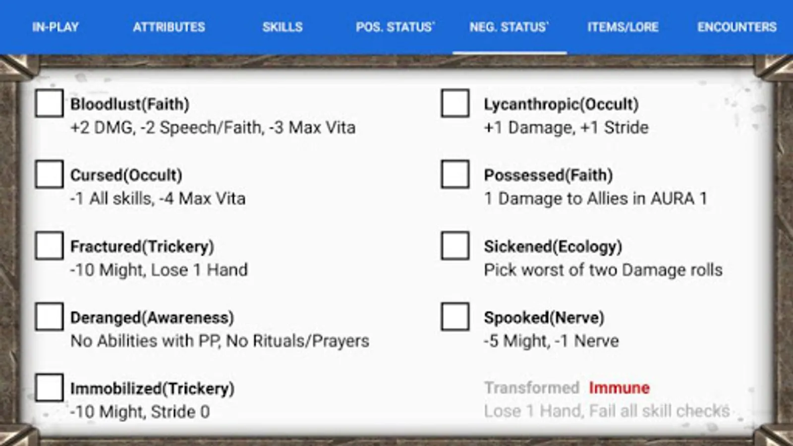 - Negative Status Tab will let you check off positive status and automatically update the Attributes, Skill and In-Play Tab.