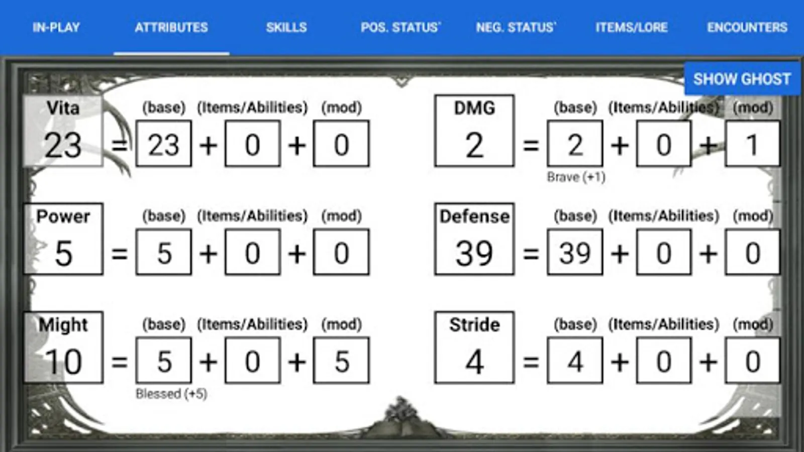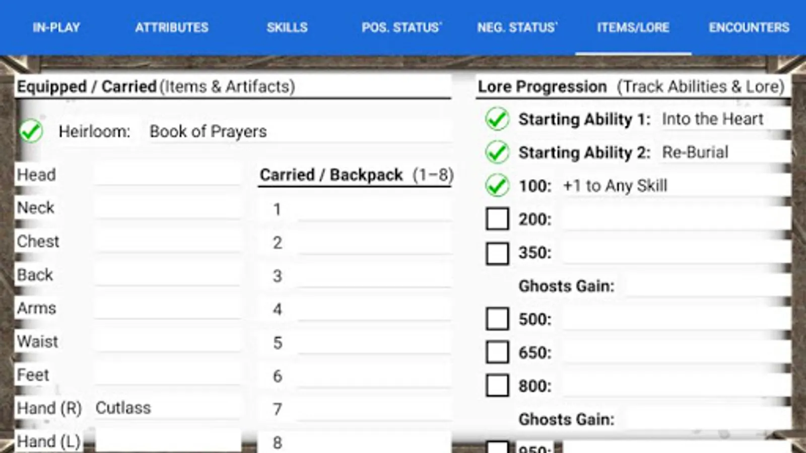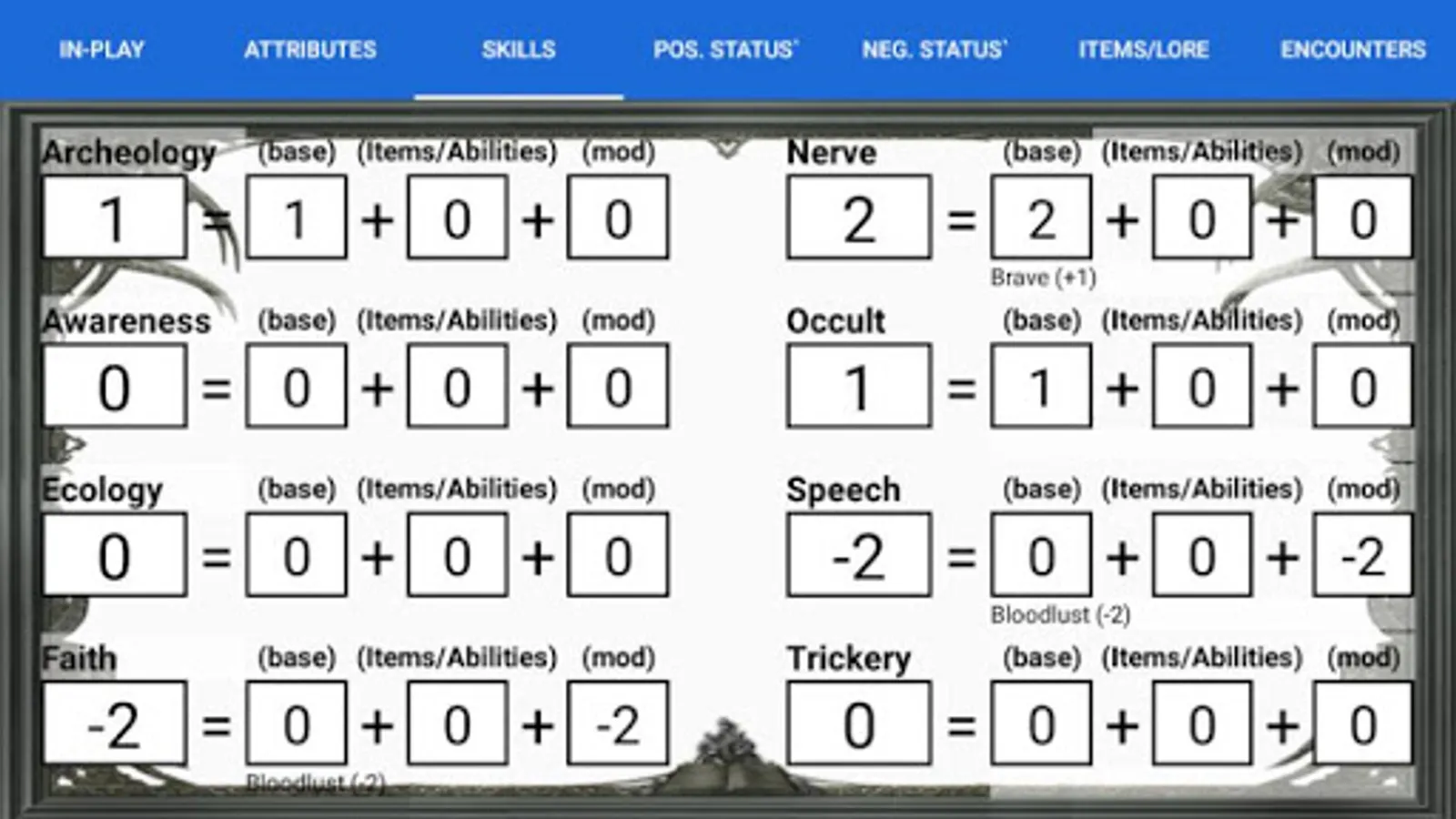 - Positive Status Tab will let you check off positive status and automatically update the Attributes, Skill and In-Play Tab.