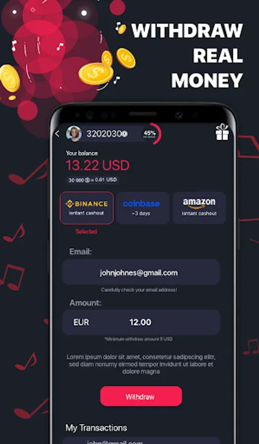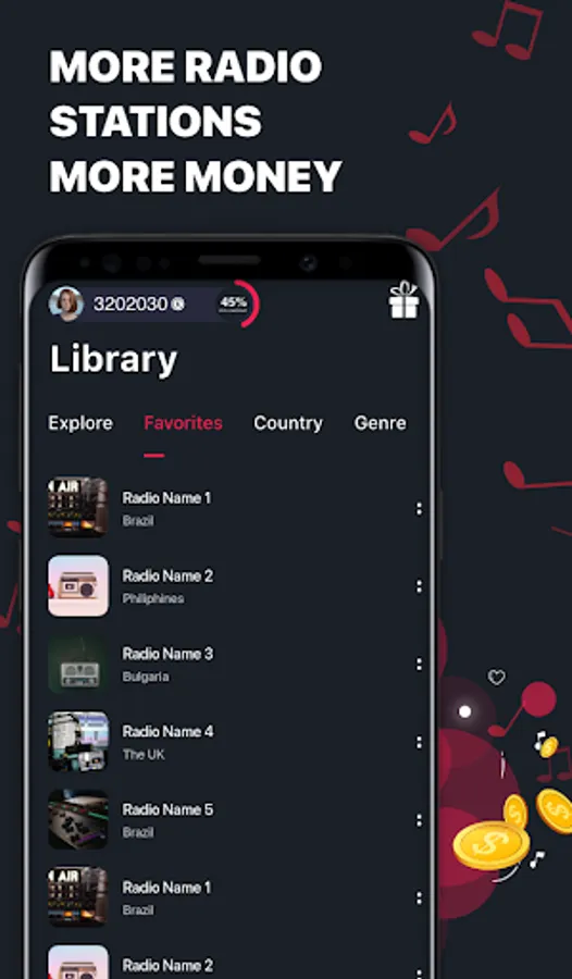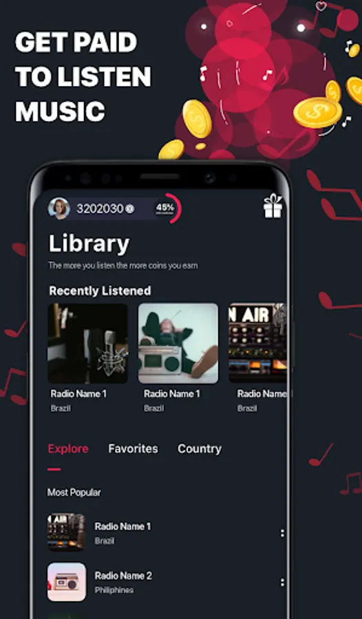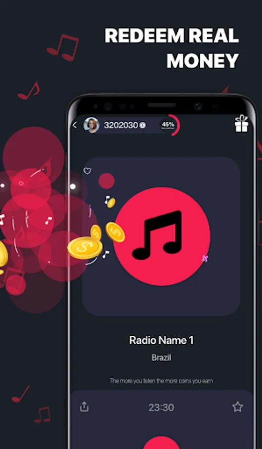 Unique, awesome platform for listening to music and earning money. Listen to your favourite radio stations and receive coins for staying in the app and earn as much as you can money!