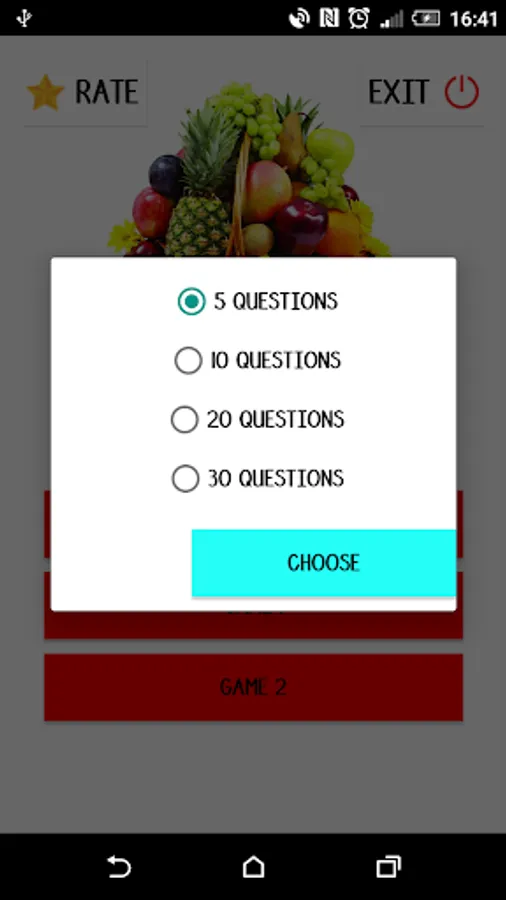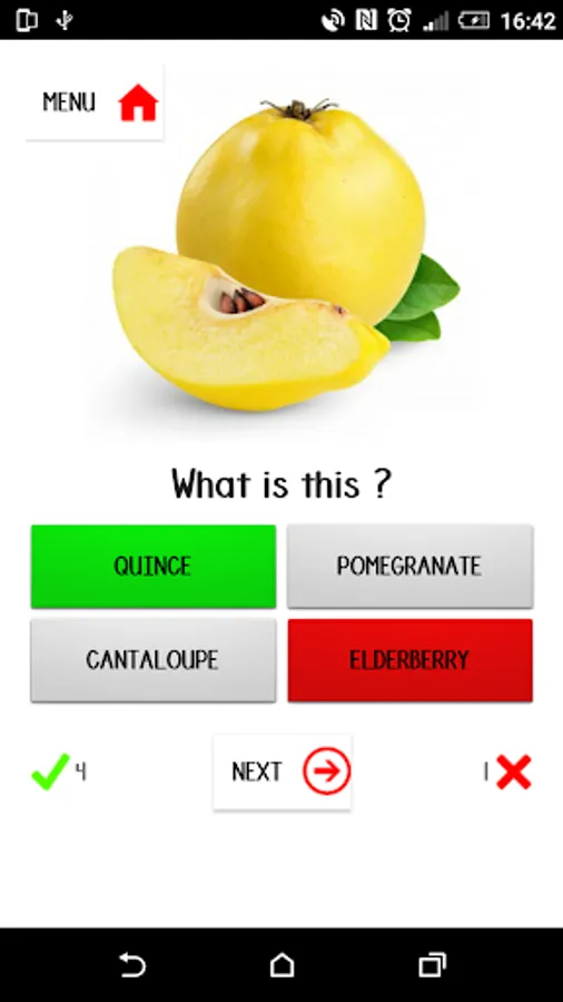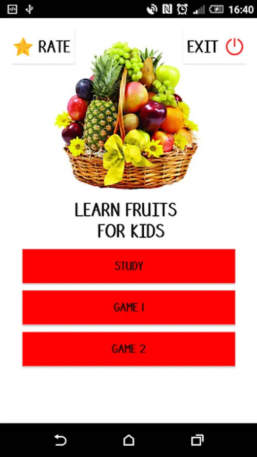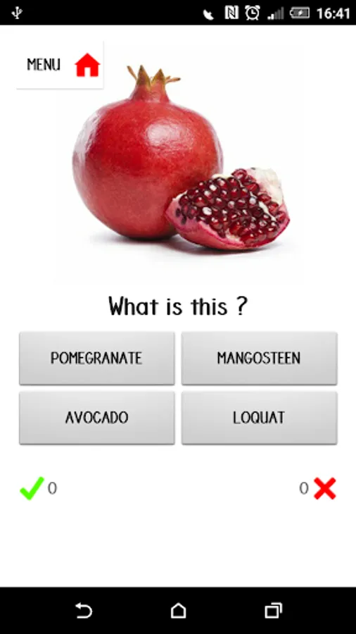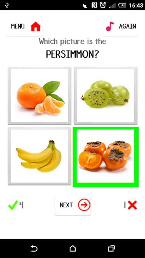 Game 1: One random fruit's picture is displayed and you are asked to select the correct word from the options.