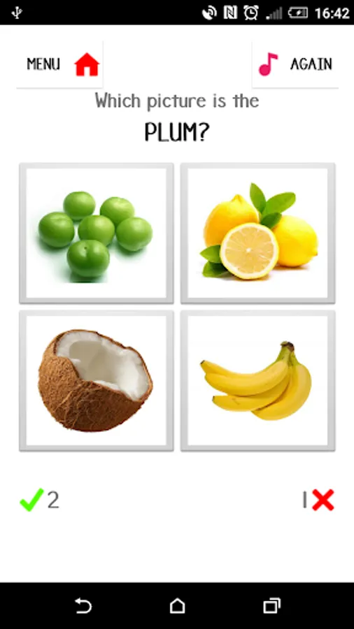 Game 2: One random fruit's word is displayed and you are asked to select the correct picture from the options.
