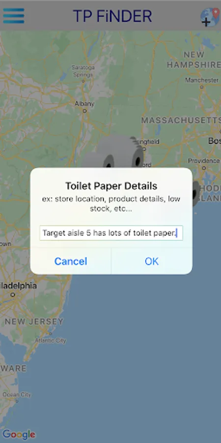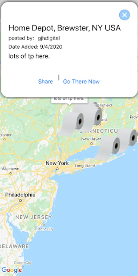 Looking for toilet paper, hand sanitizer and other essential items? TP FiNDER lets you locate and post locations where others can find essential items like toilet paper, hand sanitizer, disinfectants, and more. Register and share the location of the essential items by tapping on a pin and select "share". You can also select "Go There Now" to get directions. View your posted locations under the My Account area.