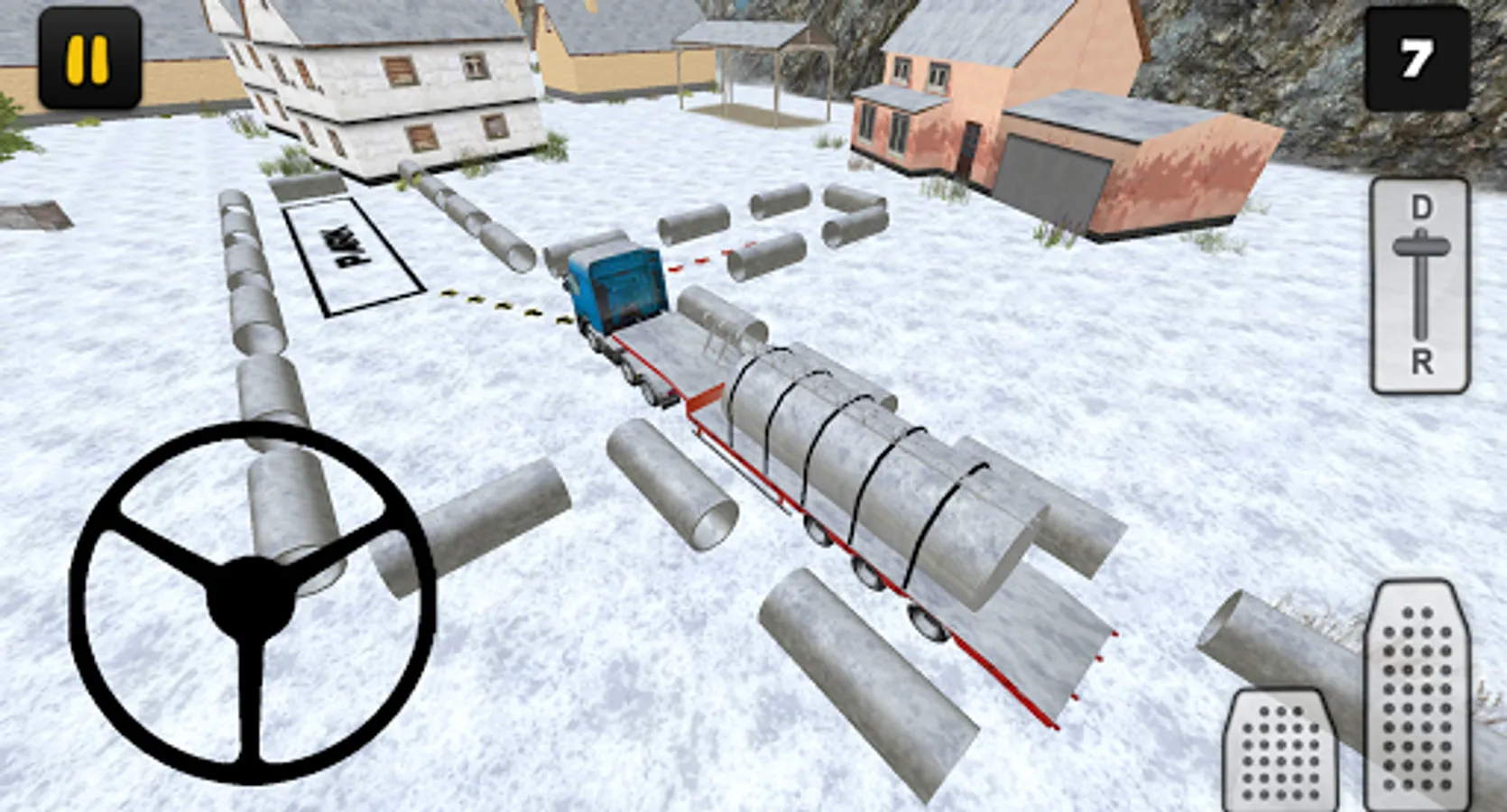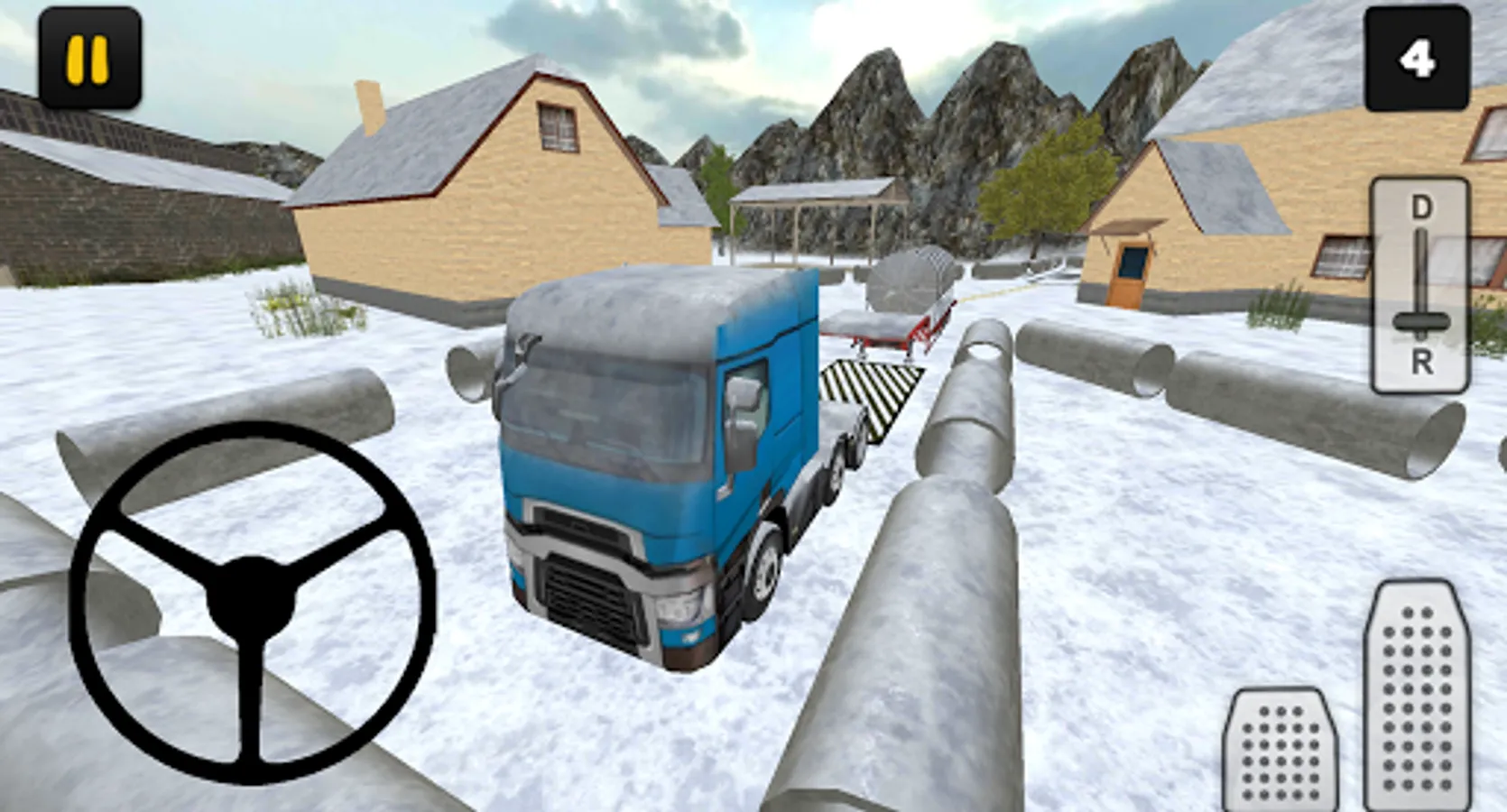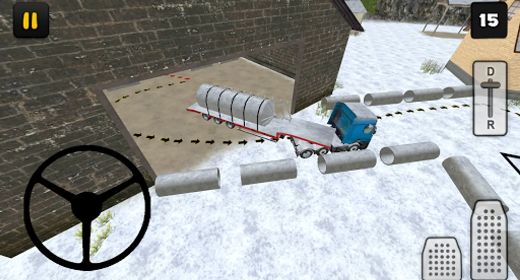 In this Silo Transport edition of Winter Farm Truck 3D you'll learn how to drive with a truck and trailer loaded with a silo. Driving in winter conditions with a truck and trailer is not easy, the roads can be slippery for example. As the driver of the truck you're responsible for a safe delivery of the silo. In 18 levels you'll experience realistic situations such as driving reverse. To finish a level you first have to attach the trailer, to do that follow the red arrows. After you've attached the trailer, you have to unload your trailer, to do that follow the black arrows.