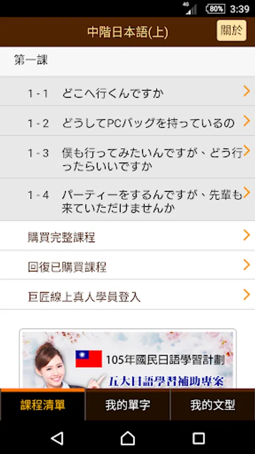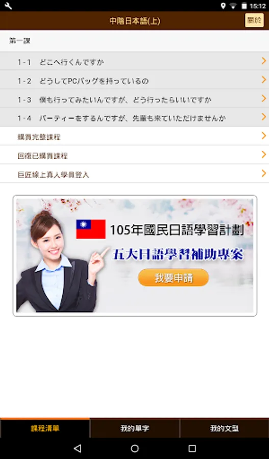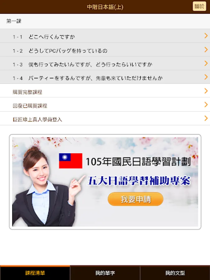 本軟體為【巨匠線上真人】與【和風數位日語】所發行的日語學習教材,讓任何想學習日語的初學者更扎實地學好基礎。全部真人發音,教材內容符合N4檢定考範圍,有效提升您單字記憶、句型應用與會話聽力能力。下載此APP您將可以隨時隨地的學習日語。【巨匠線上真人的日語課程】獨家研發科技化教學課程(含線上家教專業師資、系統化教案、點讀書、APP、數位課程),給您全方位的日語學習規劃。您可立即免費體驗!http://www.abconline.com.tw/activity/abconline/00016/Default.aspx?fromto=99235001
